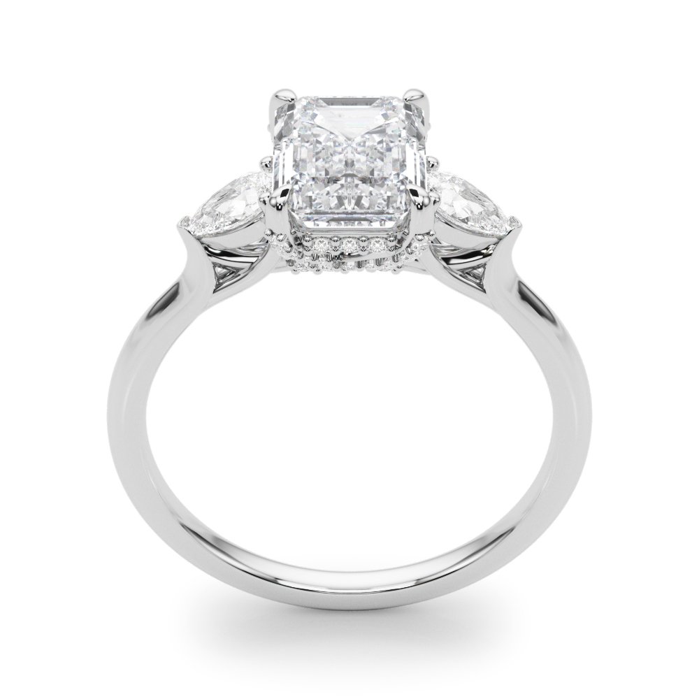 The Alara Diamond Engagement Ring is a striking three-stone design, showcasing a brilliant center diamond flanked by two pear-shaped side stones. The band features delicate pavé-set diamonds on the prongs and crown, adding an extra layer of radiance and refinement. This elegant composition enhances the center stone’s presence while offering a timeless yet distinctive silhouette.