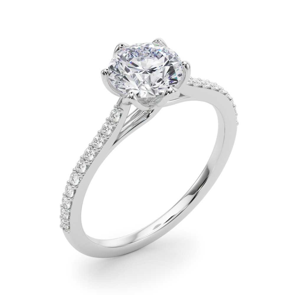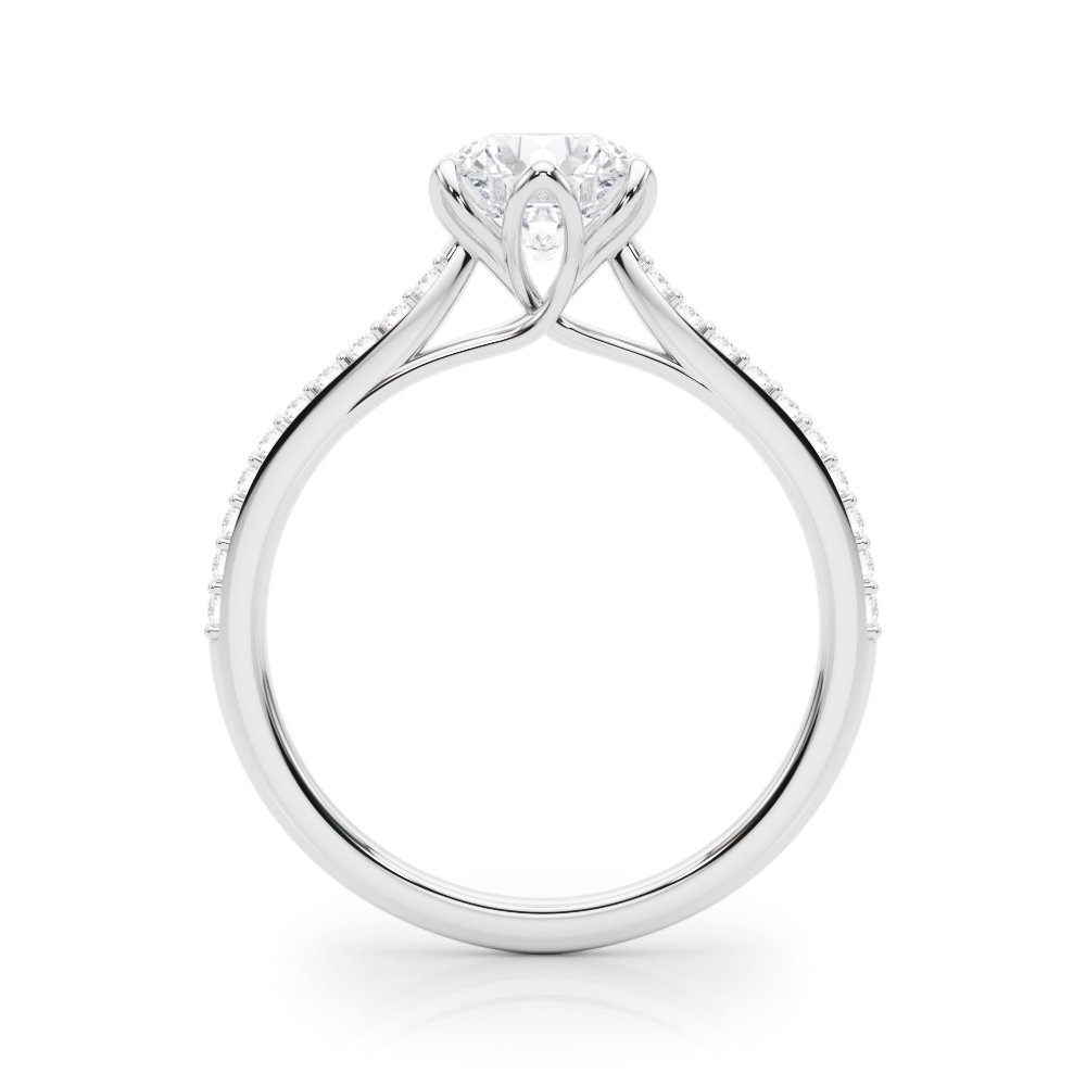 The GIA Diamond Engagement Ring features a sleek and refined silhouette with a delicate band adorned with French pavé-set diamonds along the upper shank. The elegant four-prong setting is elevated by a distinctive open cathedral design, where the prongs gracefully curve upward and inward to cradle the center stone. This airy architecture allows maximum light exposure for enhanced brilliance while maintaining a secure hold. The high-polish finish and clean lines create a modern yet timeless profile. Designed to accommodate various center stone shapes and sizes.