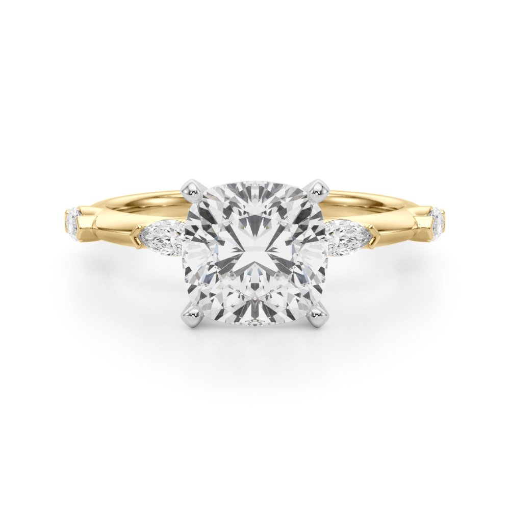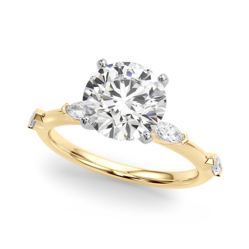 The Azalea Diamond Engagement Ring is a refined three-stone setting that blends timeless elegance with modern flair. Featuring a brilliant round center diamond accented by two marquise side stones, the design creates a graceful, elongated silhouette that draws the eye toward the center. Delicate bezel-set round diamonds on each shoulder add a subtle sparkle and architectural charm. Crafted in your choice of precious metals, the Azalea ring offers a balanced, romantic look—perfect for those who appreciate clean lines, symmetry, and distinctive beauty.