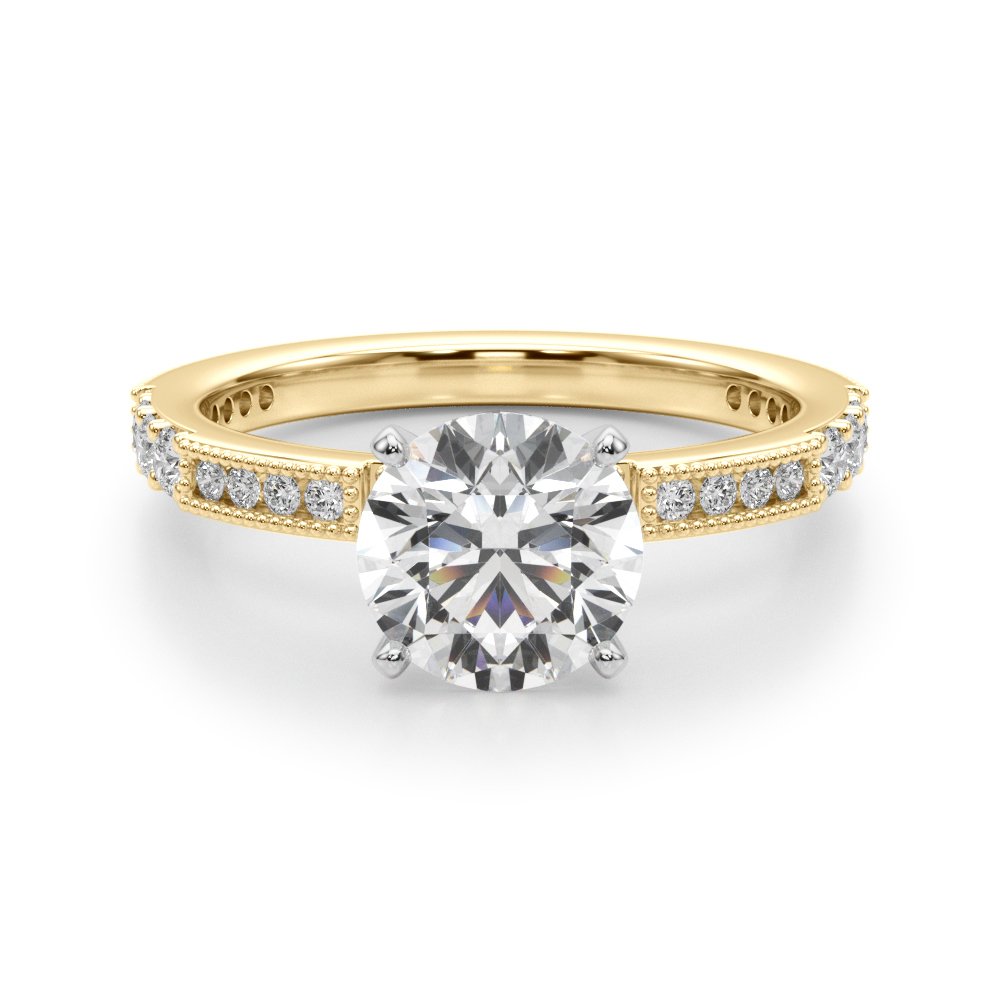 The Belle Diamond Engagement Ring features a round brilliant center diamond secured in a four-prong setting. The shank is adorned with a single row of pave-set round diamonds extending halfway down each side, providing added brilliance along the band. The band has a slightly tapered silhouette, designed to draw focus toward the center stone, and is finished with a high-polish surface for a clean, reflective appearance. The setting maintains a low to medium profile for balanced wearability and is engineered for durability and precision.