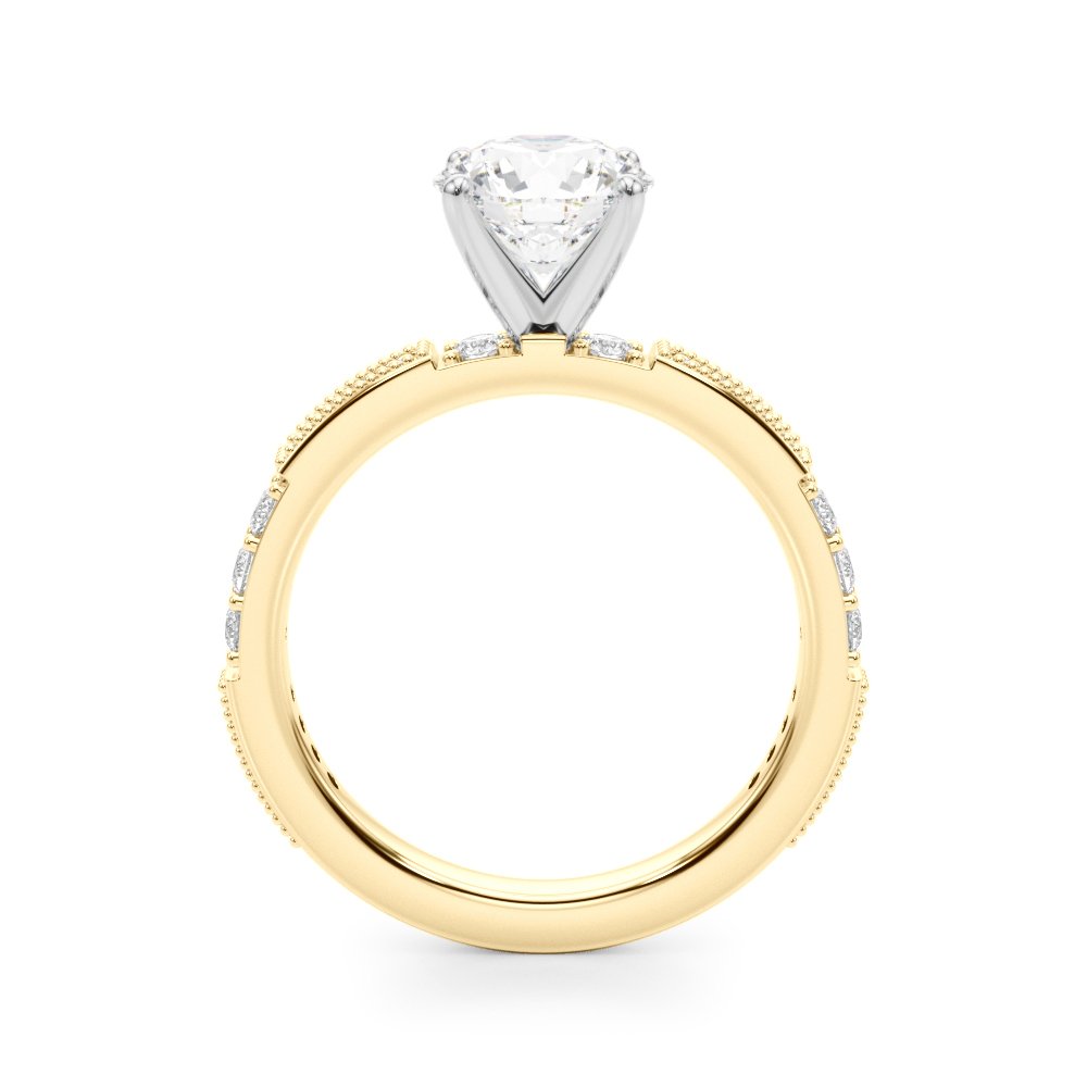 The Belle Diamond Engagement Ring features a round brilliant center diamond secured in a four-prong setting. The shank is adorned with a single row of pave-set round diamonds extending halfway down each side, providing added brilliance along the band. The band has a slightly tapered silhouette, designed to draw focus toward the center stone, and is finished with a high-polish surface for a clean, reflective appearance. The setting maintains a low to medium profile for balanced wearability and is engineered for durability and precision.