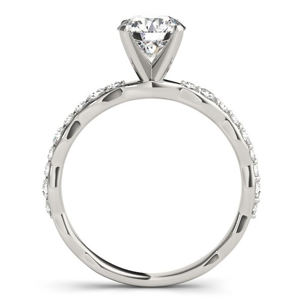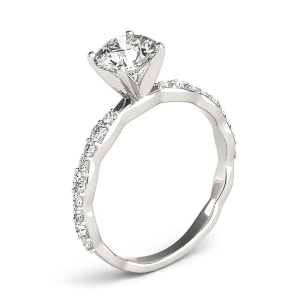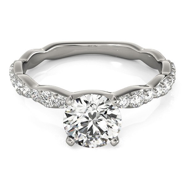 The Callie Diamond Engagement Ring features a unique scalloped diamond band with a softly contoured, petal-like design that flows gracefully toward the center stone. A round brilliant diamond is secured in a classic four-prong setting, allowing for maximum light performance and brilliance. The band is adorned with a sequence of alternating diamond sizes, creating a whimsical yet elegant profile. Crafted in high-polish metal, this ring blends organic detail with timeless sparkle. Designed to accommodate a variety of center stone shapes and sizes.