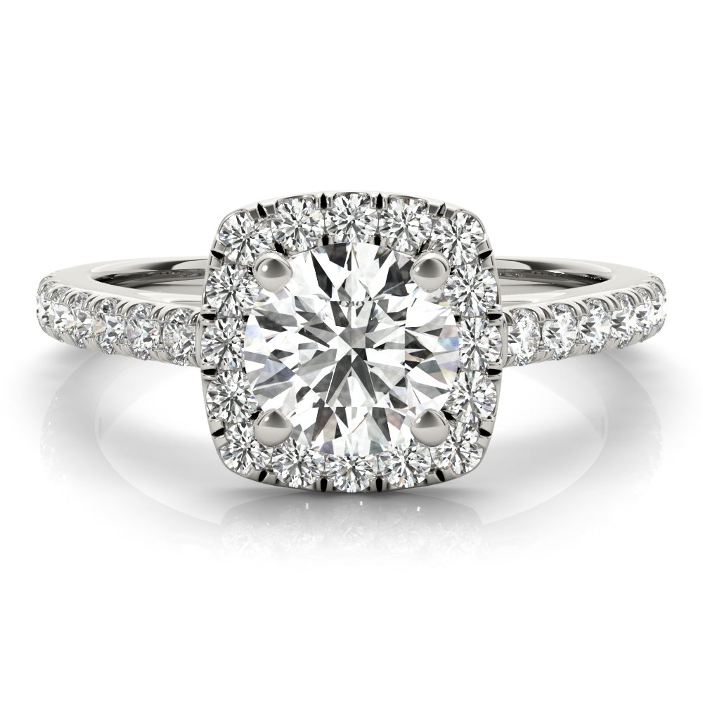 The Celine diamond engagement ring features a cathedral-style setting with a four-prong basket that elegantly elevates the center stone, complemented by a hidden halo of pavé-set diamonds just beneath the girdle for added brilliance. The slender band is adorned with a row of pavé-set diamonds extending halfway down the shank, while open gallery arches beneath the center setting allow for enhanced light flow and a refined, airy profile. This design is available for any center stone shape or size and can be crafted in the metal of your choice.