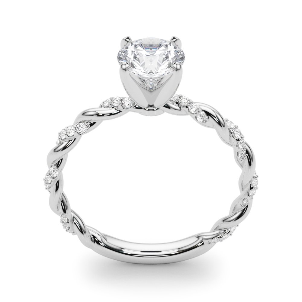 The Ella Diamond Engagement Ring features an round center diamond set on a twisted rope-style band. Interwoven with the metal are clusters of small round diamonds, creating a soft contrast between the polished twist and the sparkle of the stones. The band’s braided design adds dimension and texture while maintaining a balanced and structured form. This ring blends classic detailing with a modern silhouette for a refined and distinctive look.