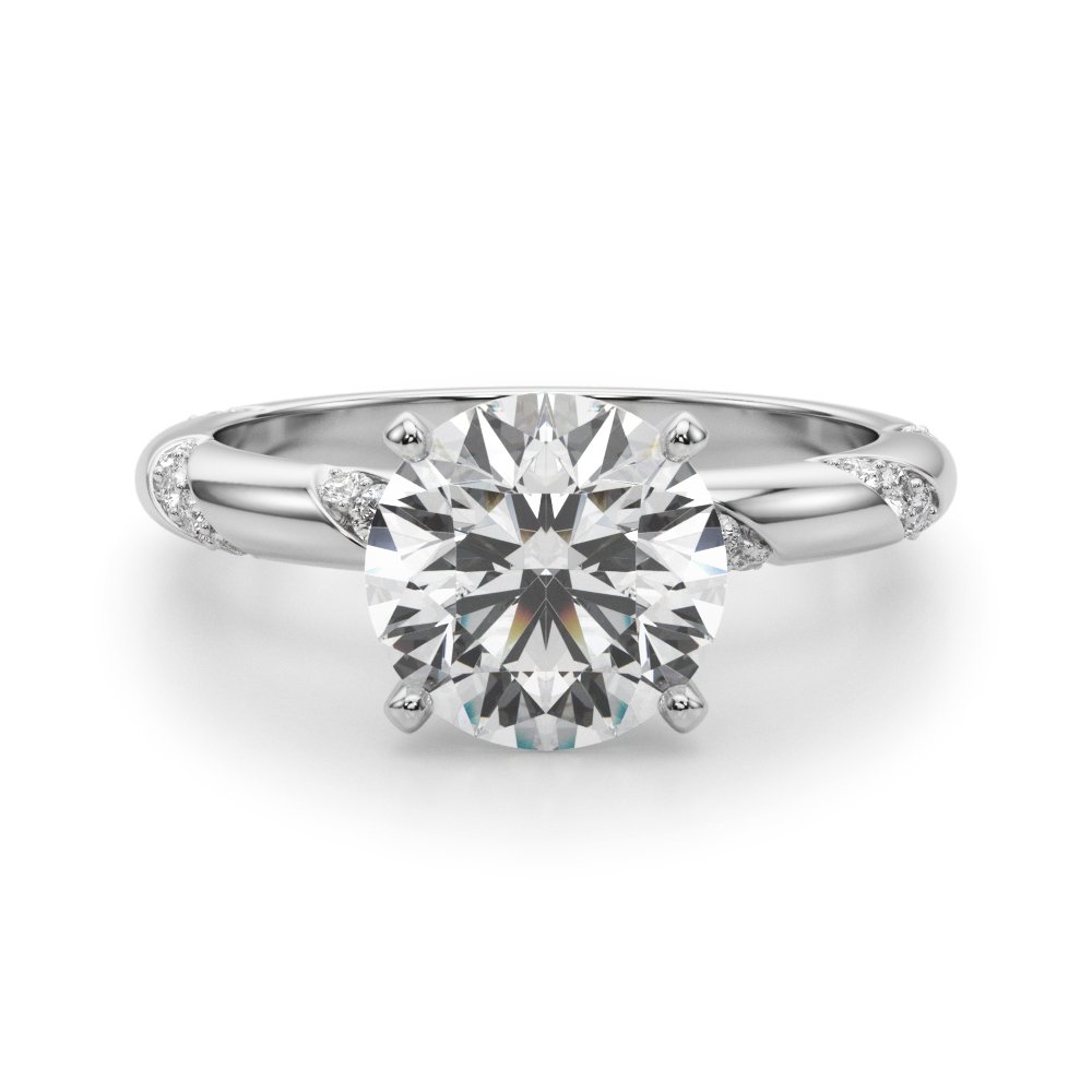 The Eloise engagement ring showcases a refined four-prong setting with straight, angular prongs that securely cradle the center stone. The band features a diamond pavé shank, meticulously set with brilliant-cut diamonds for continuous sparkle. A unique design detail at the base of the setting adds a modern, architectural touch, elevating the overall silhouette. Crafted to balance elegance with distinctive character, the Elina ring is both classic and contemporary.