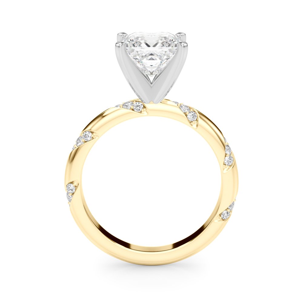 The Eloise engagement ring showcases a refined four-prong setting with straight, angular prongs that securely cradle the center stone. The band features a diamond pavé shank, meticulously set with brilliant-cut diamonds for continuous sparkle. A unique design detail at the base of the setting adds a modern, architectural touch, elevating the overall silhouette. Crafted to balance elegance with distinctive character, the Elina ring is both classic and contemporary.