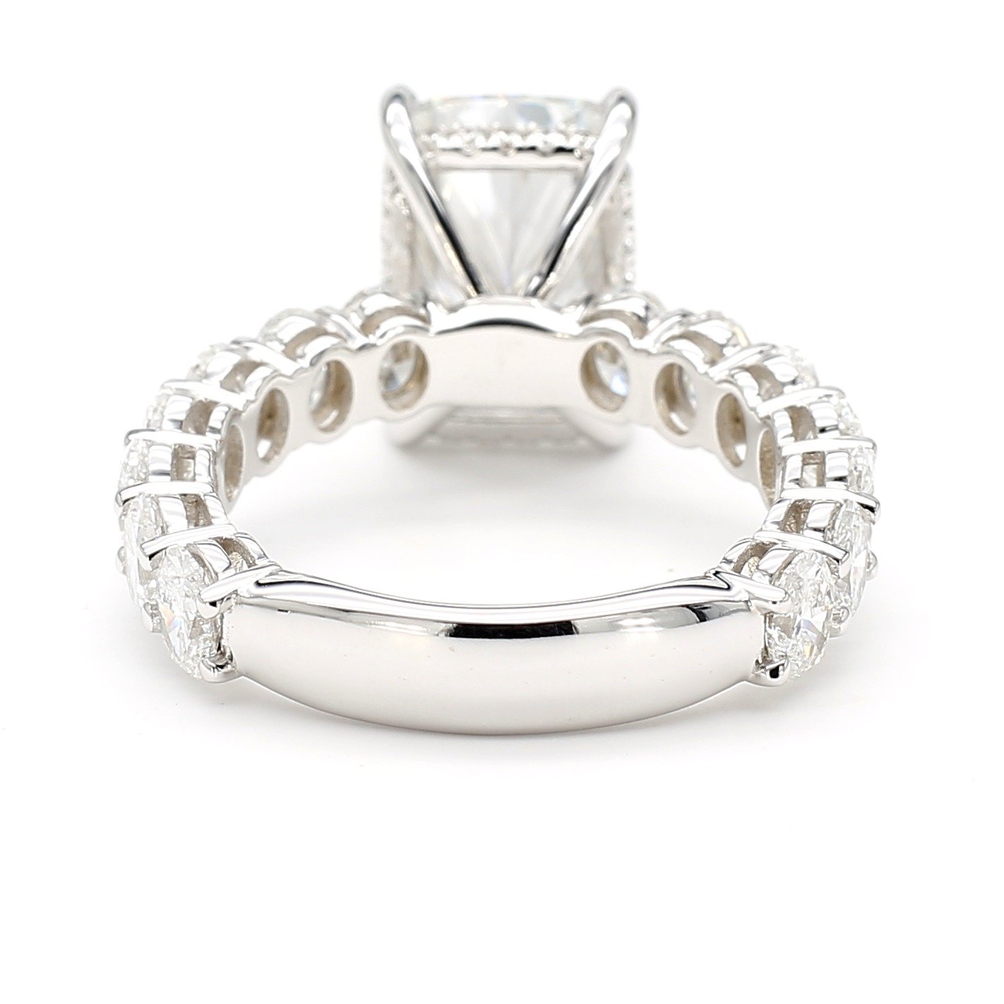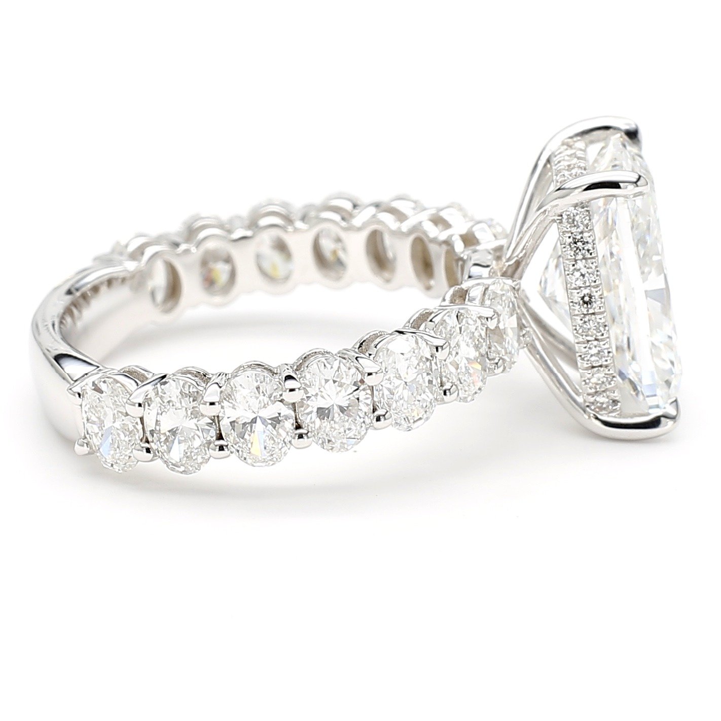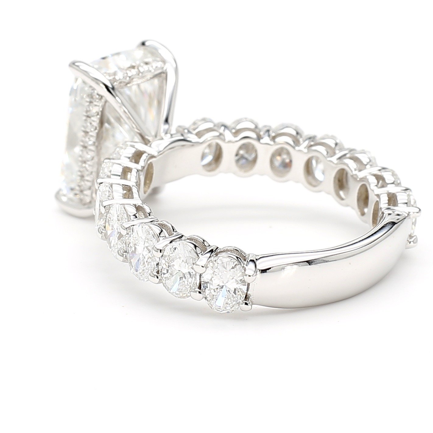 The Emily Diamond Engagement Ring is a luxurious, statement-making any diamond set in a four-prong basket with a delicate hidden halo of micro pavé diamonds wrapping beneath the crown. The band showcases a 3/4 eternity of matching oval-cut diamonds, meticulously set in a shared prong setting for maximum brilliance and continuity. Crafted in high-polished 14k, 18k, Rose Gold, platinum, the ring combines timeless elegance with contemporary glamour, offering exceptional fire and sparkle from every angle. Ideal for those seeking a bold and romantic engagement ring with a seamless blend of classic and modern design elements.