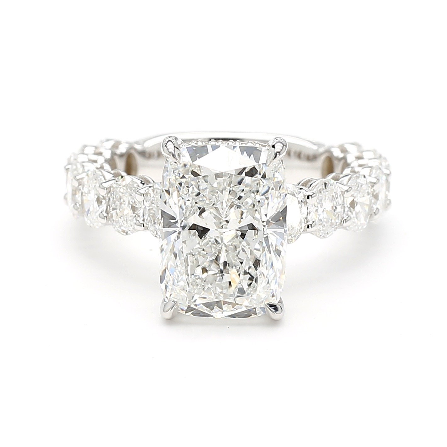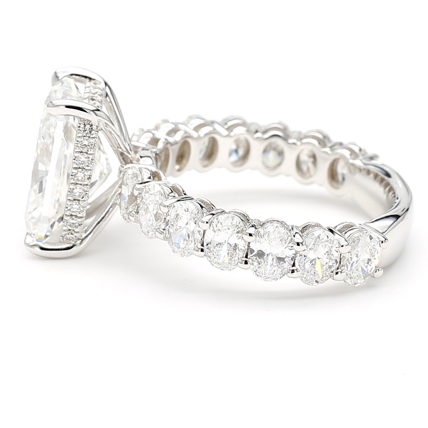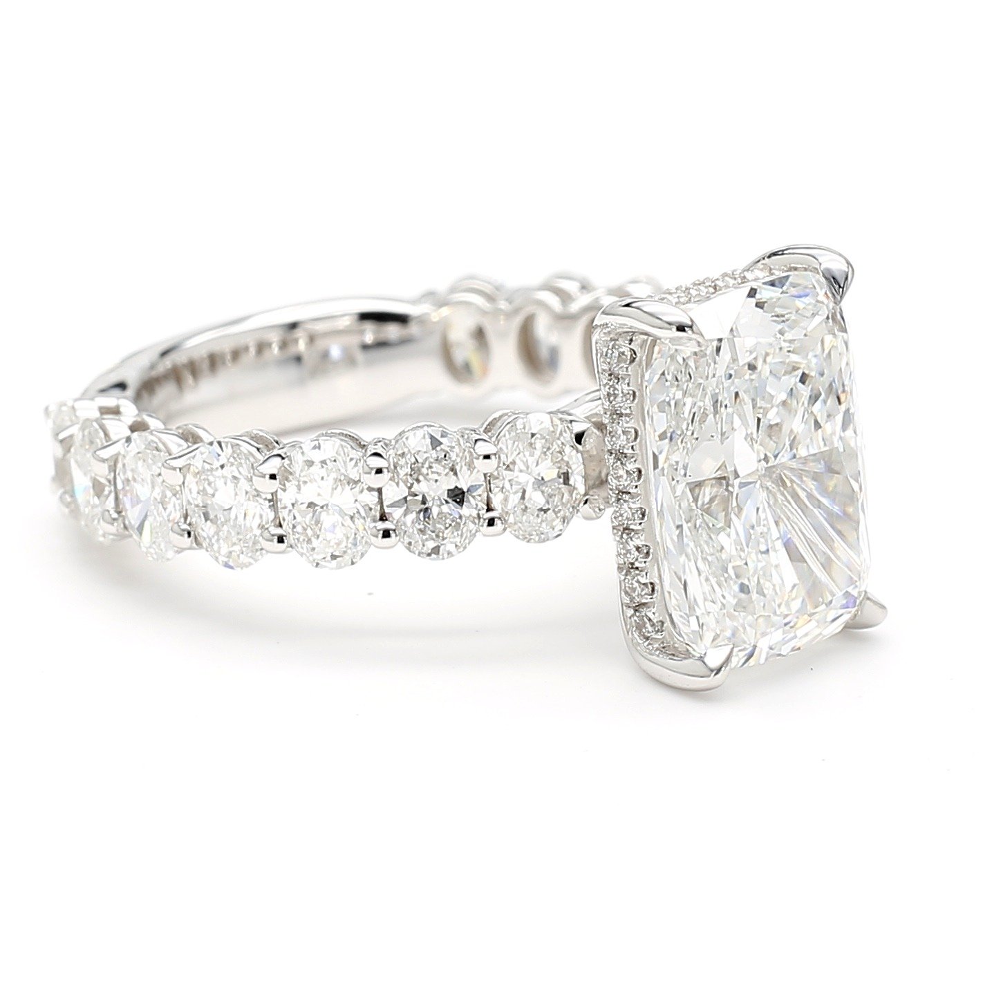 The Emily Diamond Engagement Ring is a luxurious, statement-making any diamond set in a four-prong basket with a delicate hidden halo of micro pavé diamonds wrapping beneath the crown. The band showcases a 3/4 eternity of matching oval-cut diamonds, meticulously set in a shared prong setting for maximum brilliance and continuity. Crafted in high-polished 14k, 18k, Rose Gold, platinum, the ring combines timeless elegance with contemporary glamour, offering exceptional fire and sparkle from every angle. Ideal for those seeking a bold and romantic engagement ring with a seamless blend of classic and modern design elements.