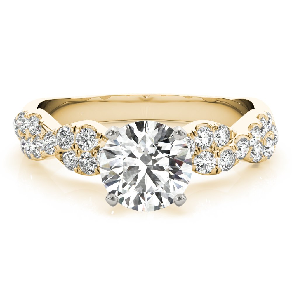 This is a white gold or platinum engagement ring featuring a round brilliant center diamond held by four prongs. The band is uniquely designed with a twisting pattern encrusted with smaller round diamonds, creating a sparkling and elegant look. The intertwined design on the band adds a sophisticated and modern touch to the classic solitaire style.