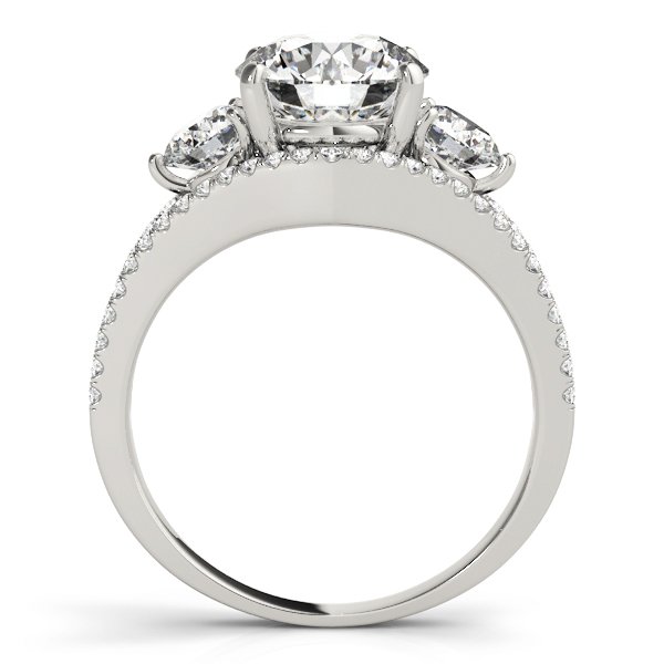 The Gig Diamond Engagement Ring features a large round brilliant center diamond secured by four prongs, flanked by two matching round side stones. The band is designed with a split-shank style and is fully encrusted with pavé-set diamonds, extending halfway down each side. All diamonds are set in polished white metal, providing contrast and continuity across the ring. The setting emphasizes size, symmetry, and surface brilliance.
