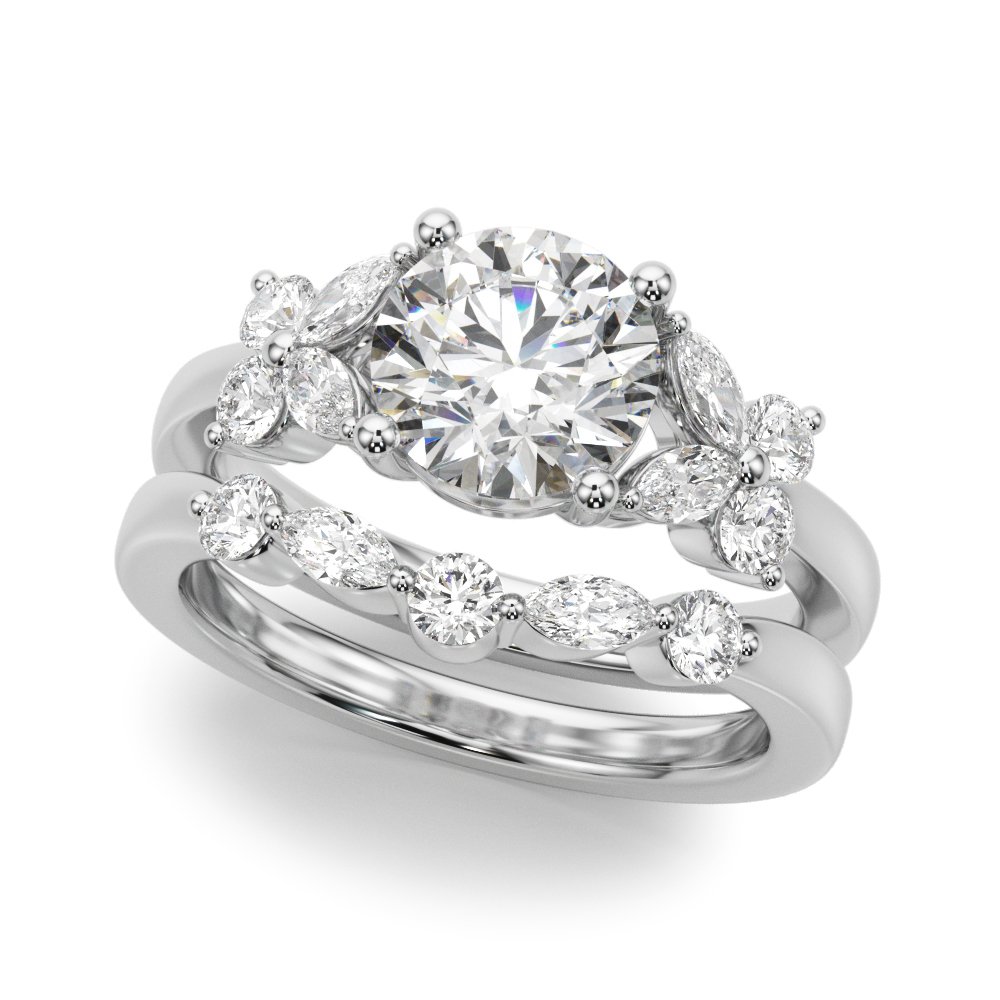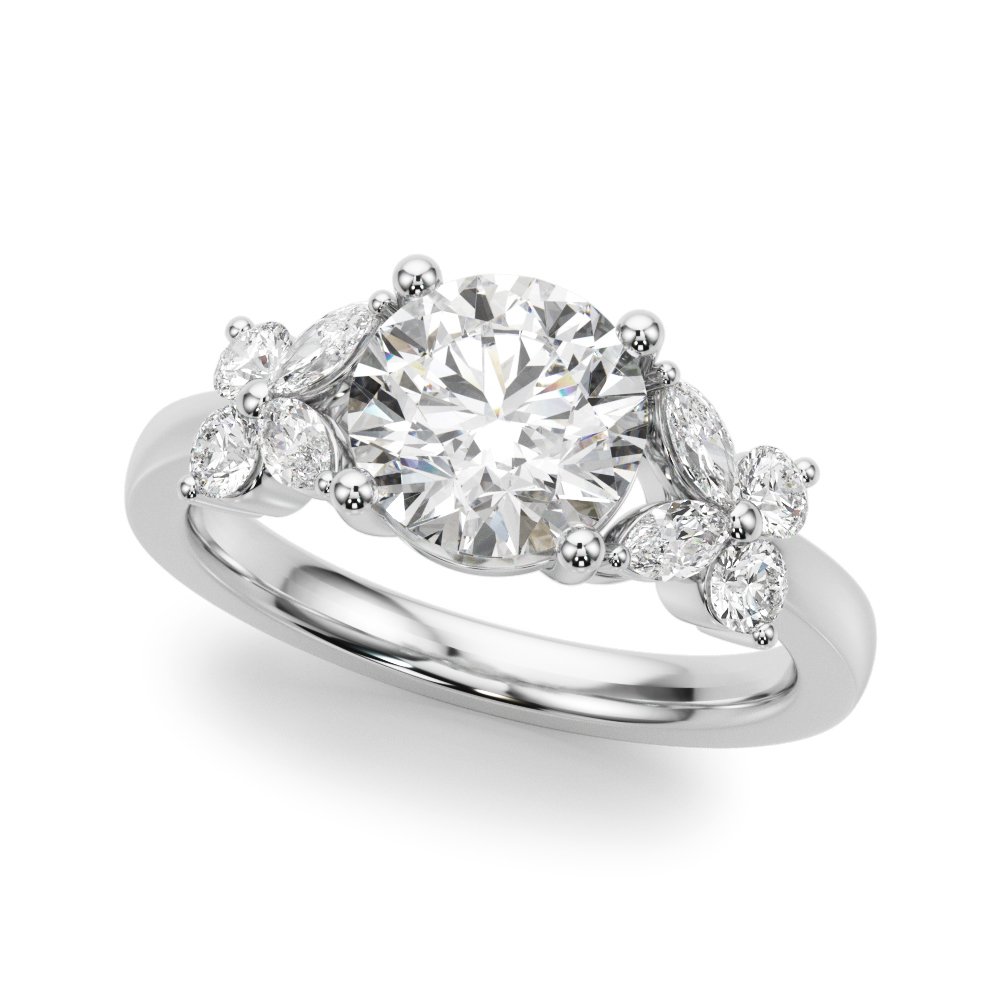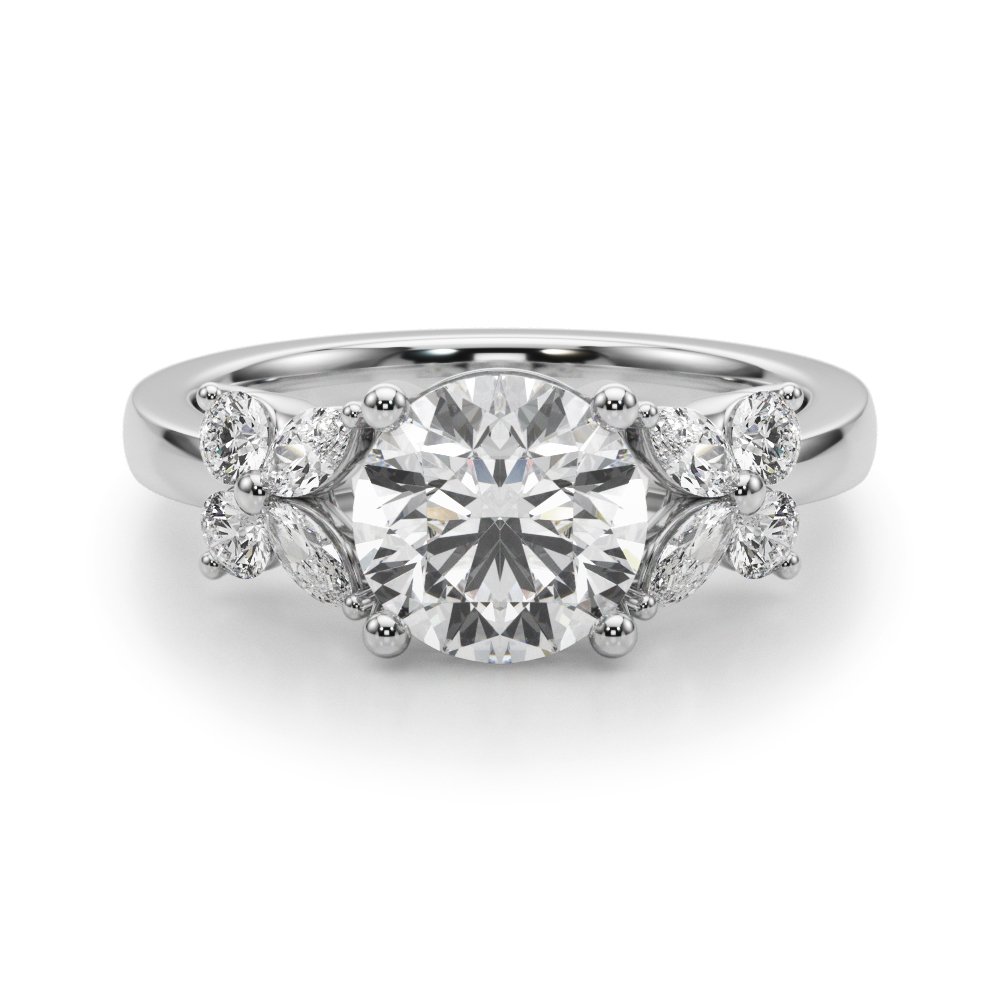 The Jade Diamond Engagement Ring features a central diamond accented by four marquise-cut diamonds set on the band—two on each side. The marquise stones are positioned to create a subtle butterfly-like effect, adding a distinctive visual element to the ring. Their tapered shape draws attention to the center stone while introducing a refined, symmetrical detail to the band’s profile. The design offers a clean and structured look with a unique silhouette.