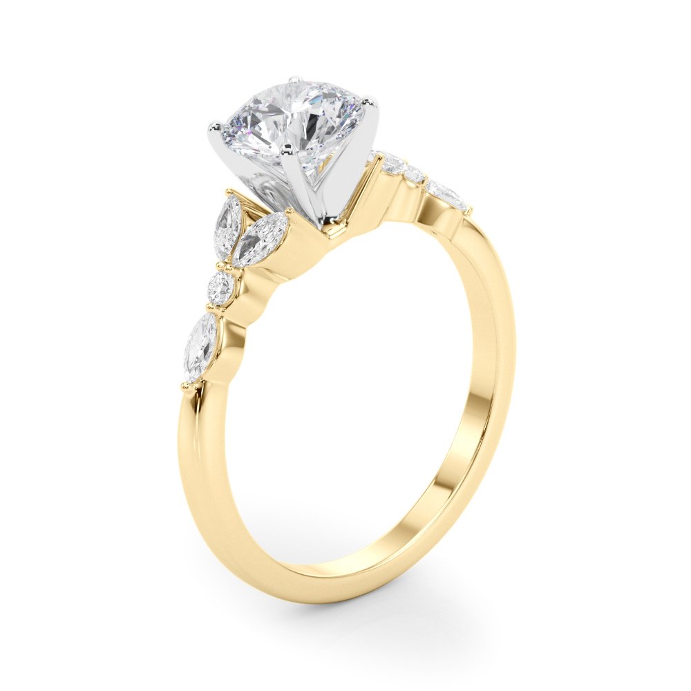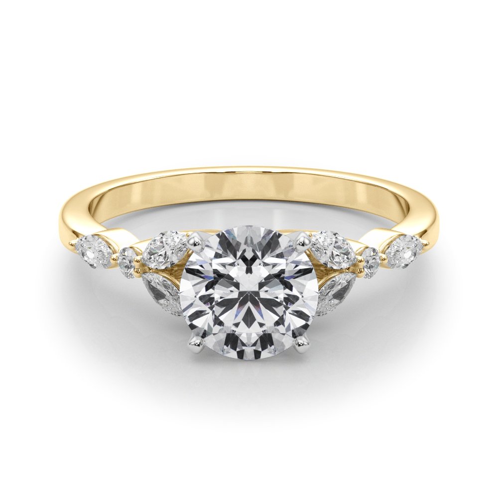 The Josie Diamond Engagement Ring features a captivating design with a trio of accent stones on each side of the center diamond. Two marquise-cut diamonds are elegantly set on the band, separated by a single round brilliant diamond, creating a symmetrical and balanced look. This distinctive arrangement adds a touch of vintage charm while maintaining a modern elegance, drawing the eye along the band and toward the center stone.