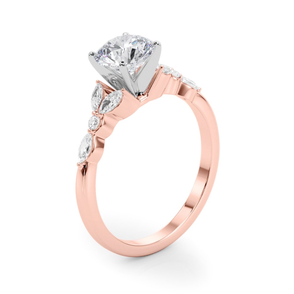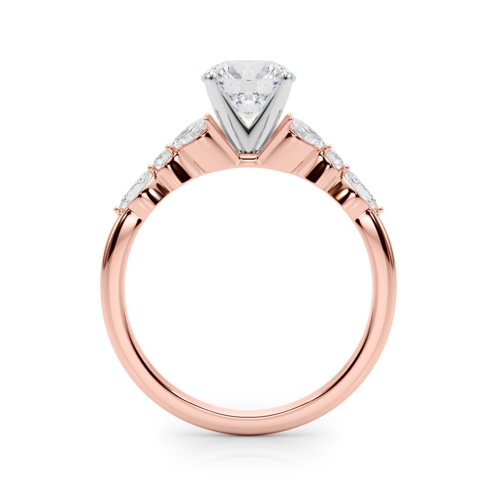 The Josie Diamond Engagement Ring features a captivating design with a trio of accent stones on each side of the center diamond. Two marquise-cut diamonds are elegantly set on the band, separated by a single round brilliant diamond, creating a symmetrical and balanced look. This distinctive arrangement adds a touch of vintage charm while maintaining a modern elegance, drawing the eye along the band and toward the center stone.