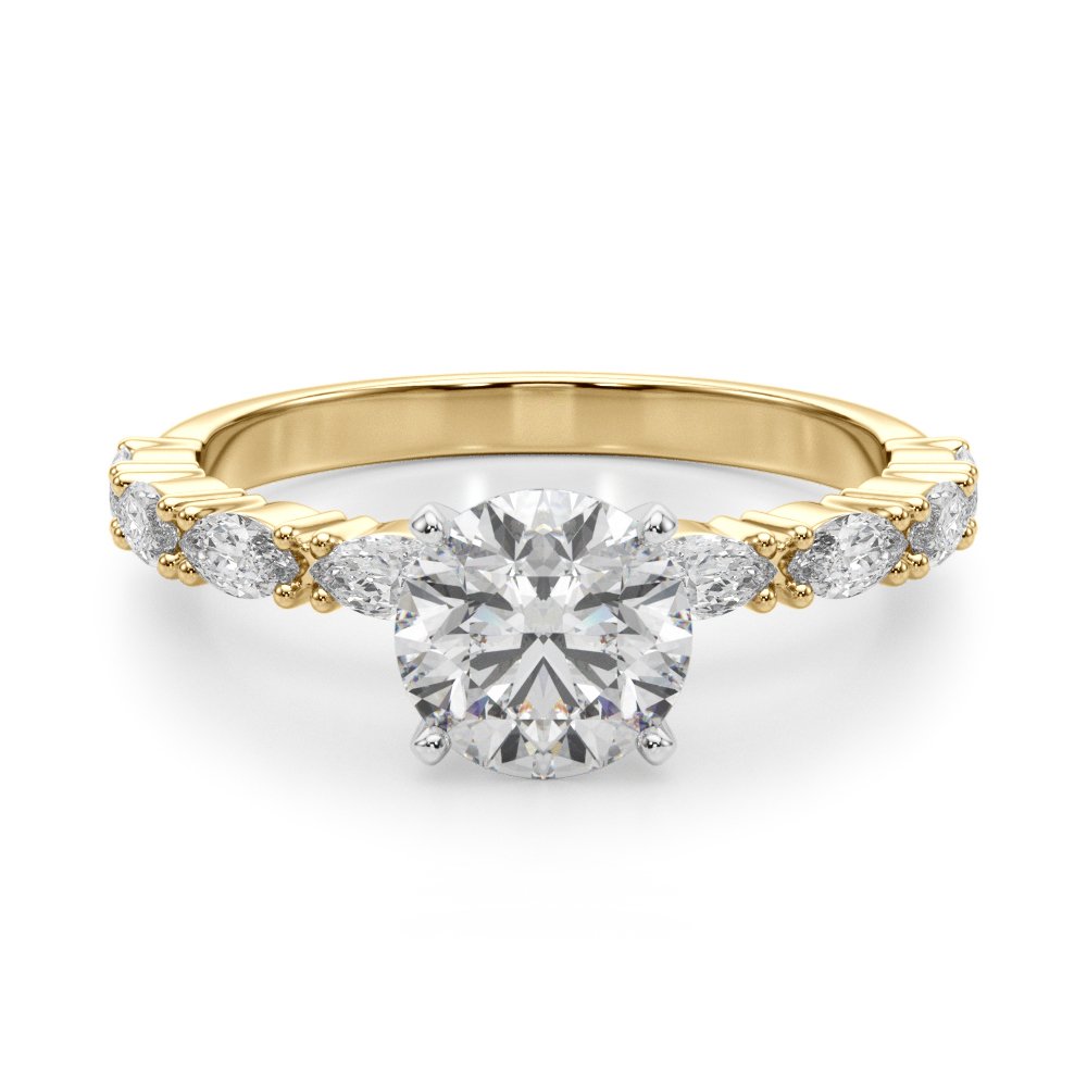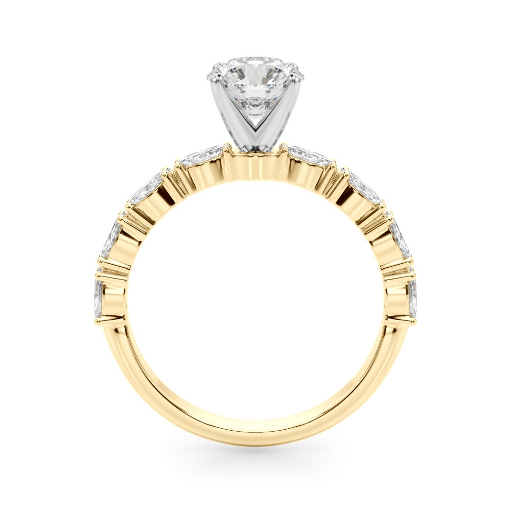The Marquise Diamond Engagement Ring features a dazzling round brilliant center stone set atop a band adorned with alternating round and tapered baguette diamonds, creating a captivating blend of sparkle and texture. This unique combination of shapes gives the ring a modern edge while maintaining a timeless feel. The diamonds are expertly set for maximum brilliance, and the polished band ensures comfort and elegance. With its sophisticated silhouette and distinctive detailing, the Lena ring is perfect for those who want a classic look with a contemporary twist.
