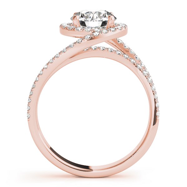 The Liora ring features a round brilliant-cut center diamond secured in a four-prong setting, encircled by a halo of smaller round diamonds. The band has a split-shank design, with each side lined with pavé-set diamonds that twist gracefully around the halo, creating a dynamic and flowing silhouette. This combination of the halo and twisting pavé band maximizes sparkle and adds a modern elegance to the overall design.