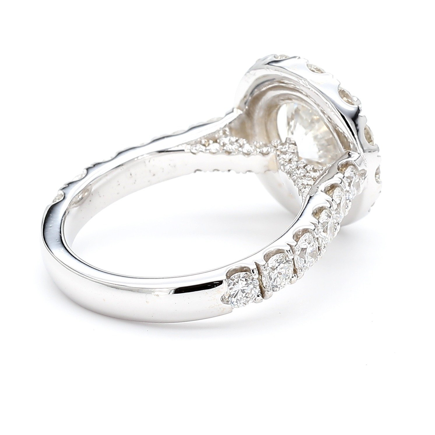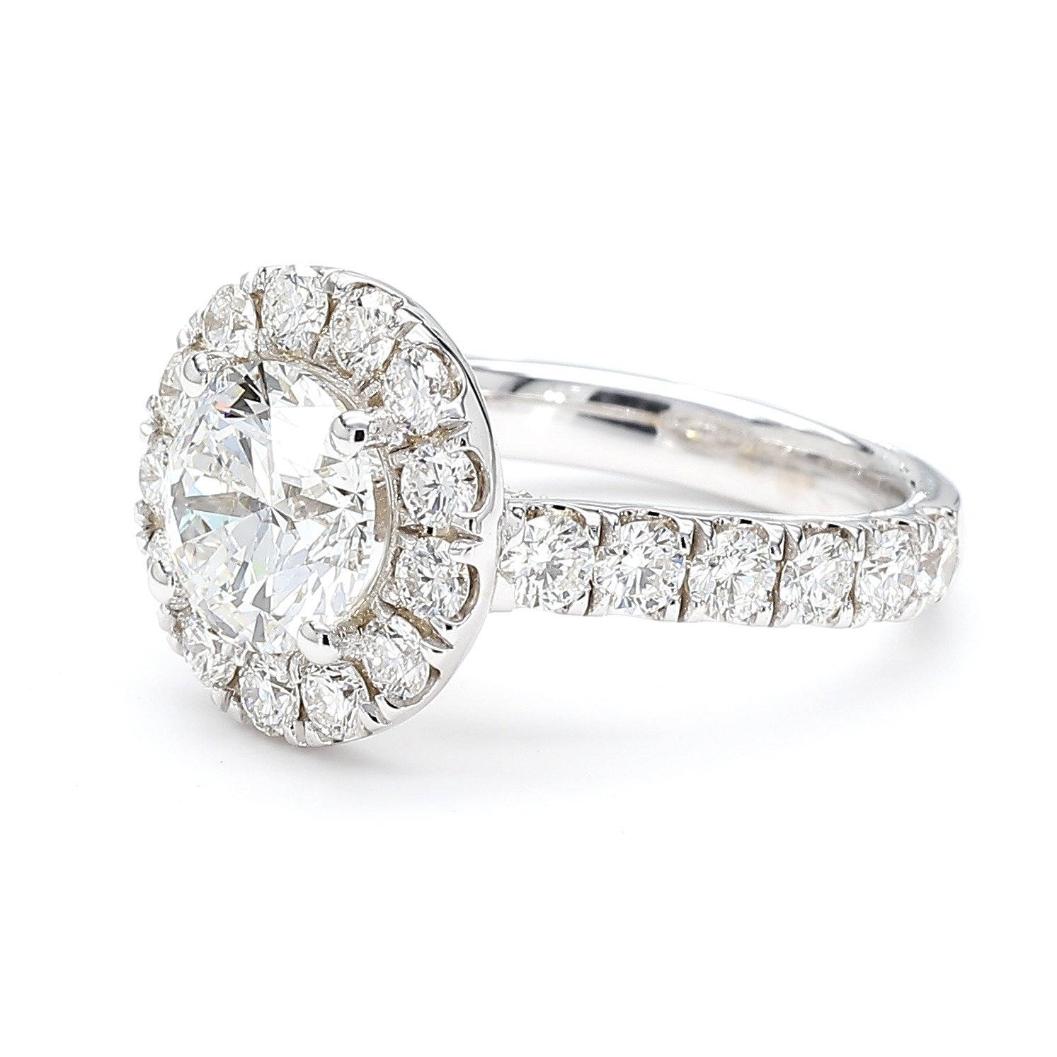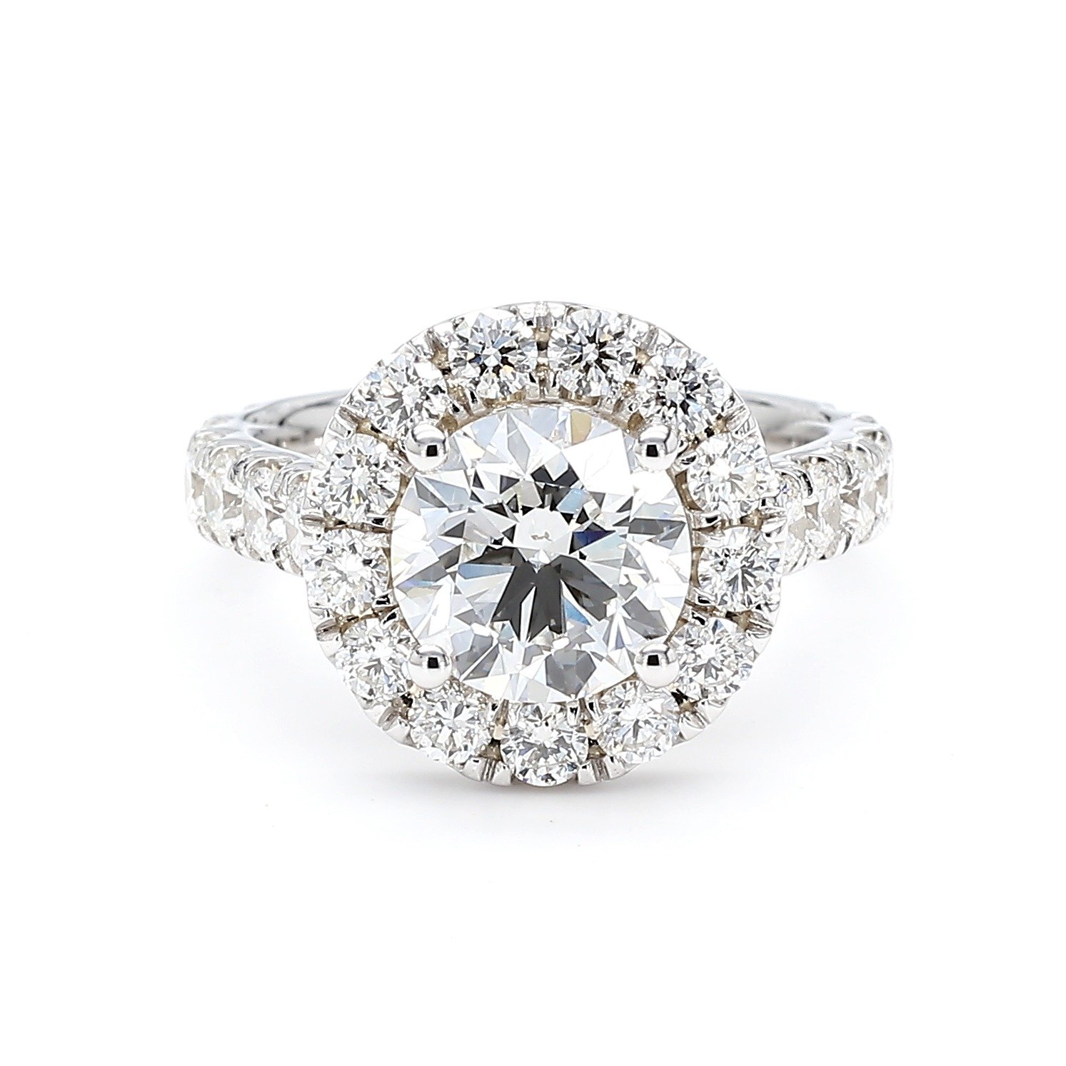 The Lucia Diamond Engagement Ring showcases timeless sophistication with its elegant design and exquisite craftsmanship. Set in high-polish platinum white/yellow gold, the ring features a brilliant round-cut center diamond encircled by a delicate halo of pavé-set diamonds that amplify its sparkle. The band is adorned with a row of meticulously matched round diamonds extending halfway down the shank, offering a seamless display of brilliance. The open gallery and cathedral-style shoulders add depth and light performance, creating a refined balance between classic beauty and modern allure.