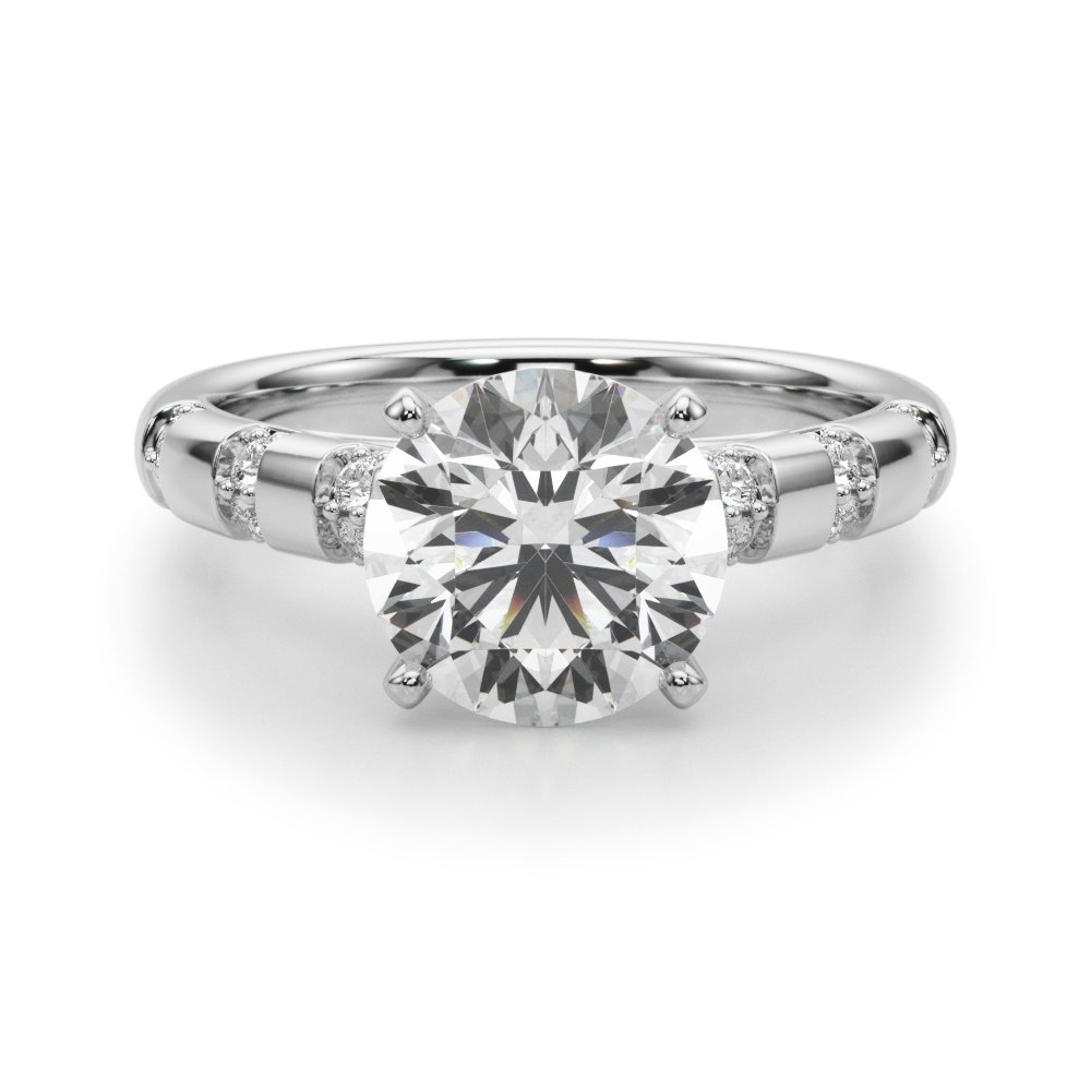 The Lyra setting features a cathedral-style profile with a high-arching shoulder design that securely supports the center stone. The band incorporates spaced round accent diamonds set in individual polished segments for uniform brilliance and structural balance. The prong head is elevated to maximize light return while maintaining stability. An open undergallery allows additional light flow and facilitates easy cleaning. Compatible with most center stone shapes and available in all standard precious metals.