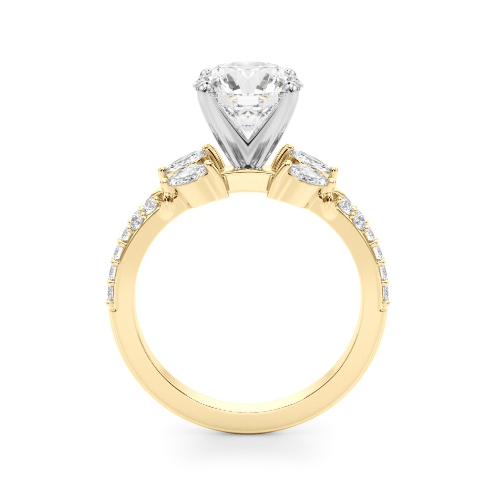 The Madeline Diamond Engagement Ring features a round brilliant center stone secured by four prongs. The band is adorned with graduated side stones, including oval and round diamonds, set in a shared-prong arrangement that extends partially down the shank. The design incorporates a symmetrical arrangement for balanced proportions and a refined profile.