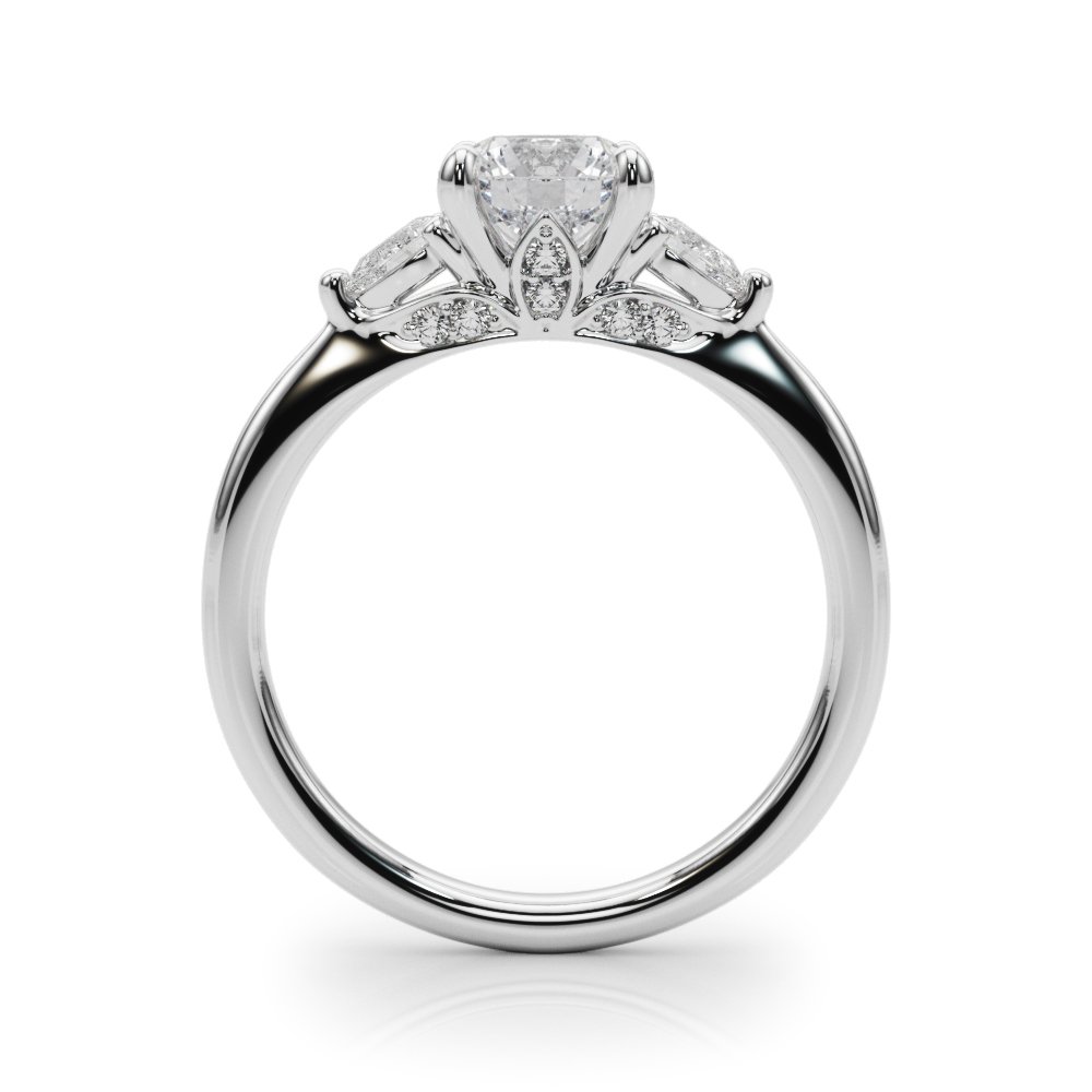 The Mimi Diamond Engagement Ring features a round brilliant center diamond set in a four-prong yellow gold basket, flanked by two pear-shaped side diamonds. The setting includes a hidden row of pavé diamonds beneath the center for added detail. The band is smooth and slightly tapered, designed for a balanced and comfortable fit. This three-stone ring combines structural symmetry with subtle accents for a refined presentation.