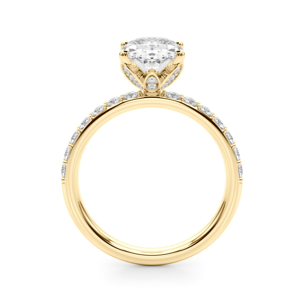 The Mira Diamond Engagement Ring showcases a round brilliant center diamond elevated in a refined four-prong cathedral setting, with a hidden halo and a delicate bezel-set peekaboo diamond accent for added charm. The band features intricately intertwined pavé-set diamonds that shimmer from every angle, gracefully tapering toward the base for comfort. From the side, the ring reveals a romantic and detailed gallery with openwork that allows light to pass through, enhancing the brilliance of the center stone. Crafted in your choice of precious metals, the Mira design beautifully balances elegance, artistry, and modern sophistication