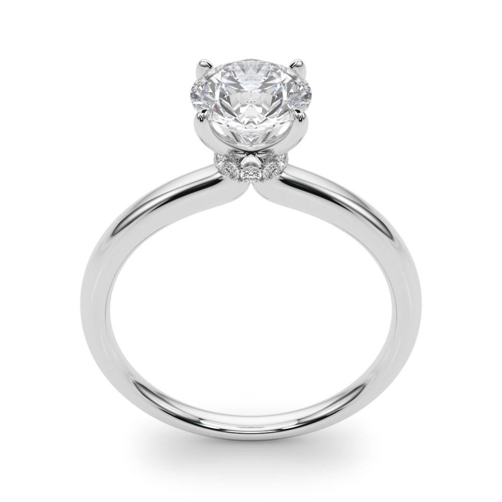 The Mira Diamond Engagement Ring features a classic solitaire band with a smooth, high-polish finish and a clean, minimal profile. The center stone is secured by a four-prong setting designed to accommodate any diamond shape or size. A hidden halo of pavé-set diamonds is positioned just above the shank, providing a subtle accent that enhances the brilliance of the center stone without interrupting the ring’s streamlined silhouette. Compatible with all precious metals, including platinum and 14k or 18k gold in white, yellow, or rose. Engineered for durability and a seamless fit with most wedding bands.