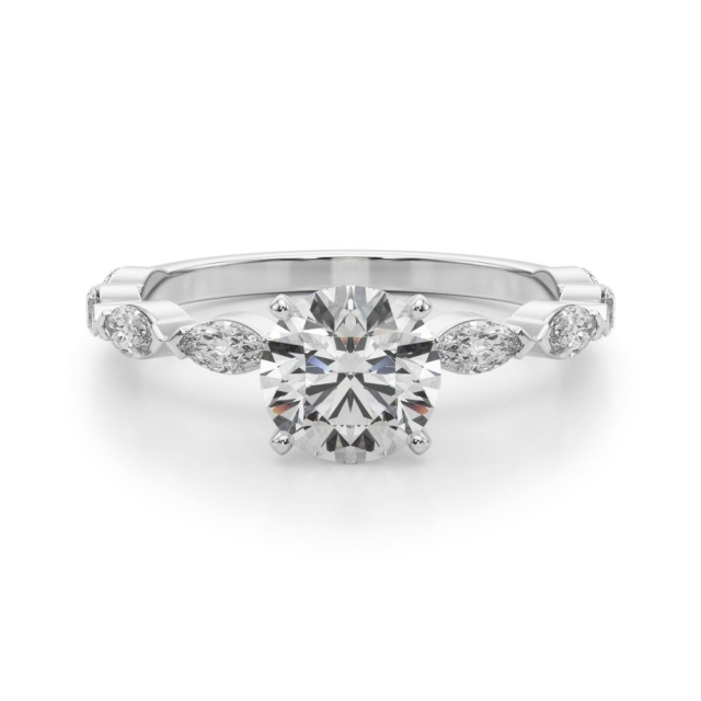 The Nova design has gorgeous curves tapering slightly towards the center. The center diamond is secured in a basket.