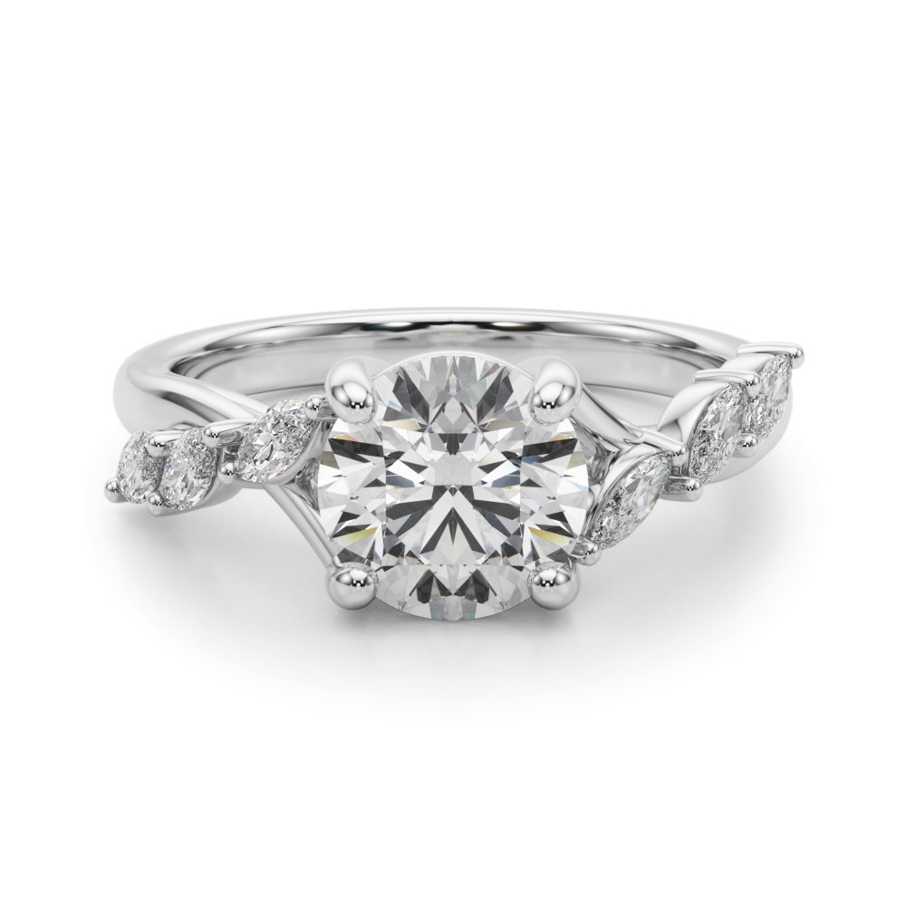 The Piper Diamond Engagement Ring features a central diamond with six marquise-cut side stones set on the band, three on each side. The marquise stones are arranged symmetrically to enhance the overall profile of the ring. Their elongated shape adds subtle detail and additional light reflection along the band, complementing the center stone without overpowering it. The design balances clean lines with geometric accents for a structured, polished look.