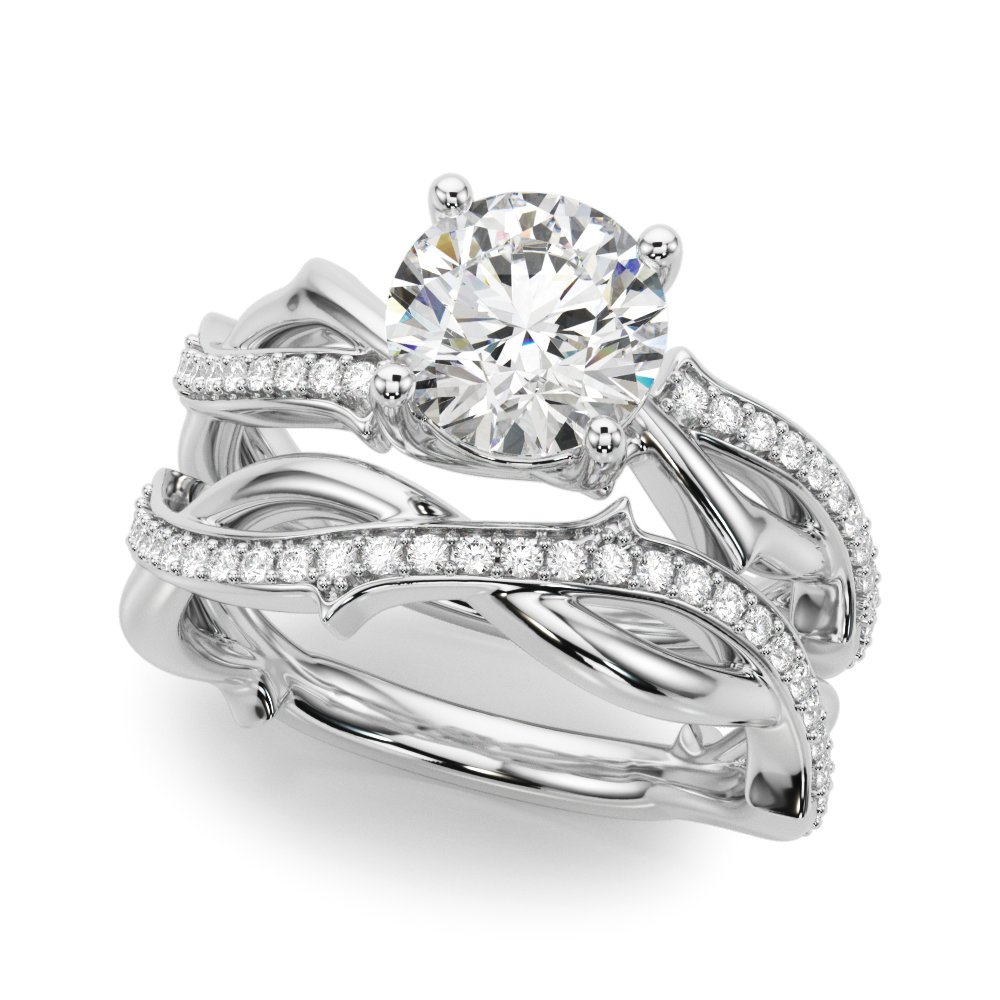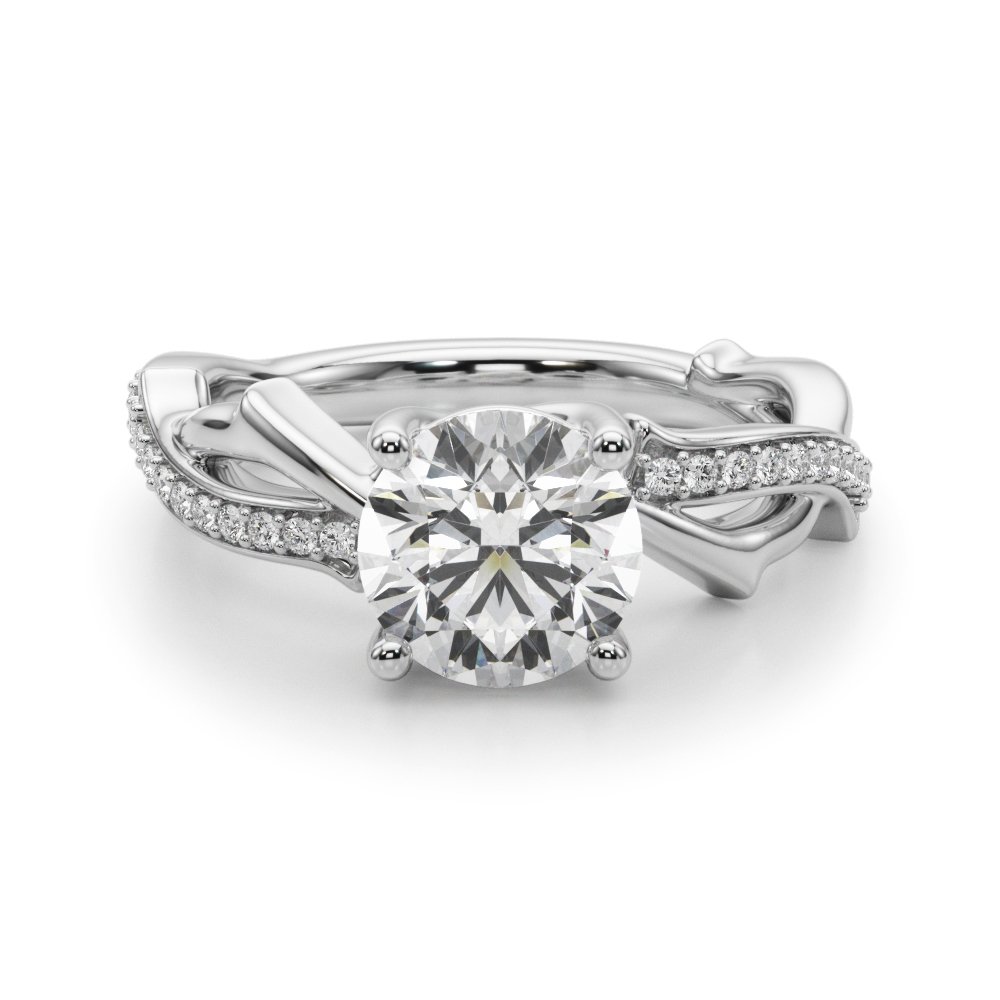 The Renee Diamond Engagement Ring features a round brilliant-cut center diamond secured by four prongs, set on an intertwined band design. One strand of the band is polished metal, while the other is adorned with pavé-set round diamonds, creating a twisted split-shank structure that joins at the base.