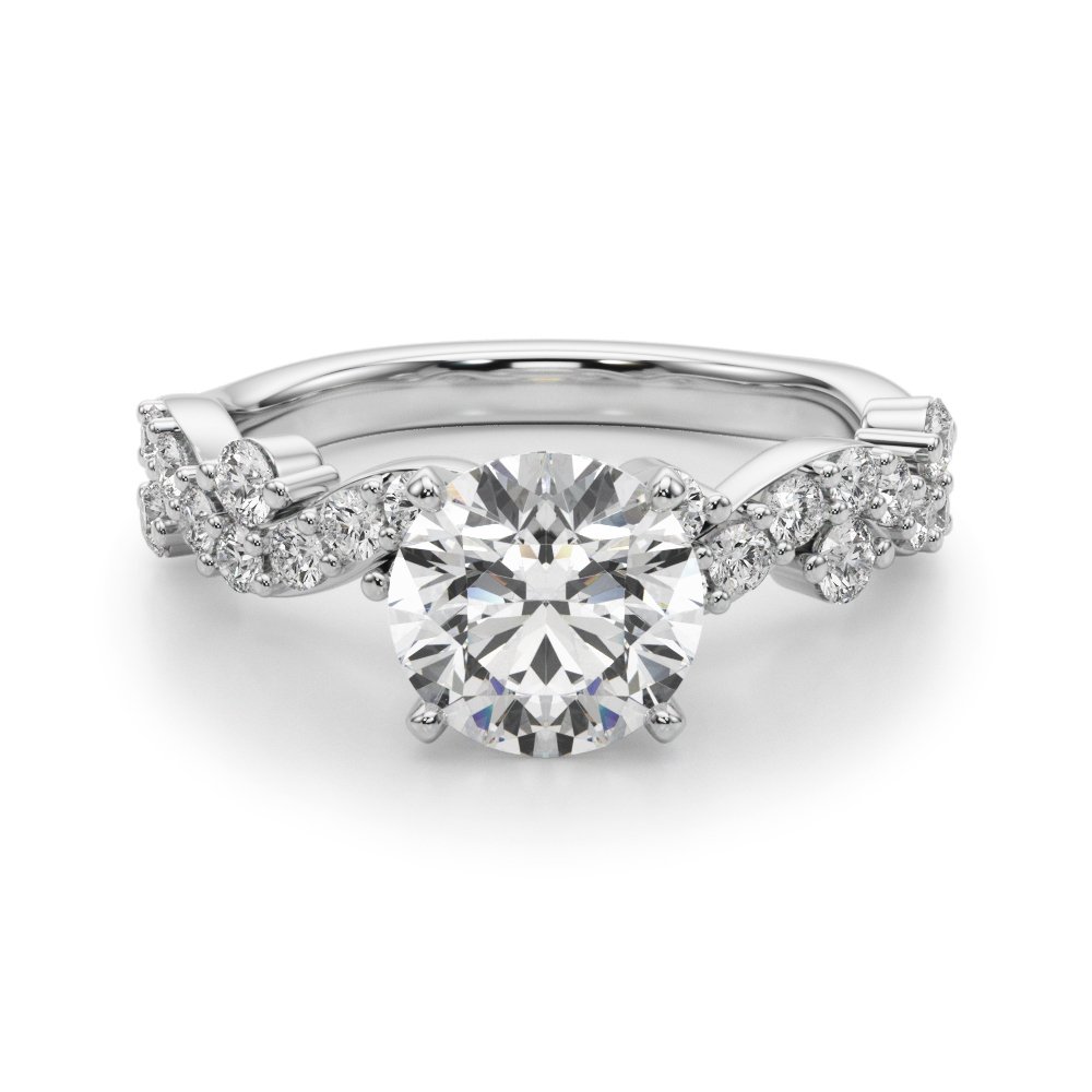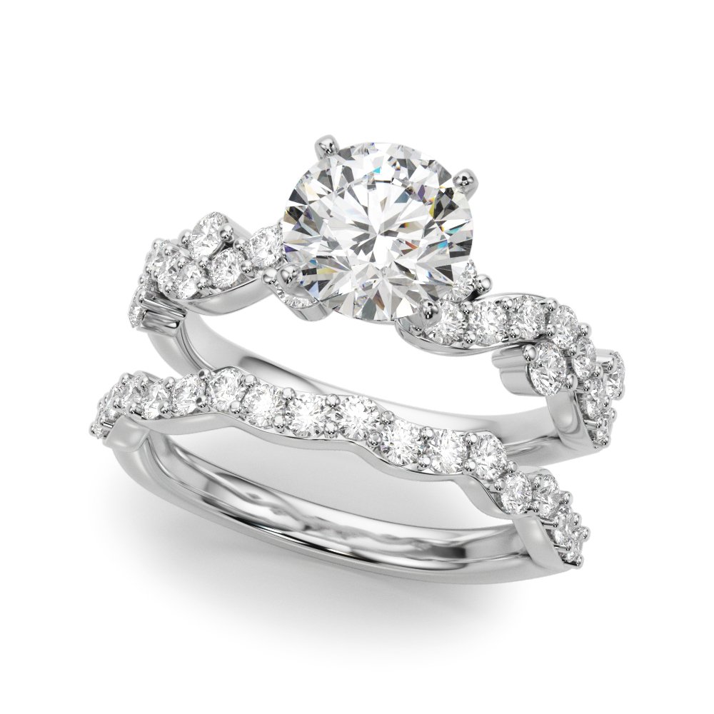 The Rio Diamond Engagement Ring features a round center diamond set on a curved, pavé-set diamond band. The band’s gentle wave shape creates a sense of movement, while the closely set round diamonds add continuous brilliance across the surface. The design highlights symmetry with a soft, sculptural flow, offering a modern interpretation of a classic diamond band. Clean lines and precise detailing give the ring a balanced and polished look.