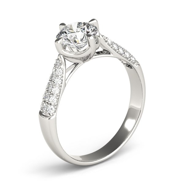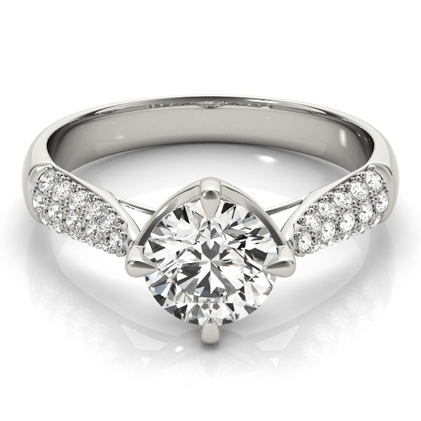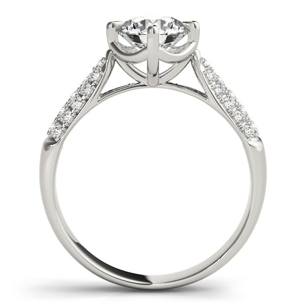 The Skye setting features a split shank design with three rows of pavé-set diamonds on each side, offering balanced brilliance and structural integrity. The center stone is secured by four claw-style prongs in a distinctive triangular formation, maximizing light entry while ensuring durability. The tapered shoulders enhance finger coverage without adding bulk, maintaining a low-profile comfort fit. Compatible with most diamond shapes and available in platinum, white gold, yellow gold, and rose gold.