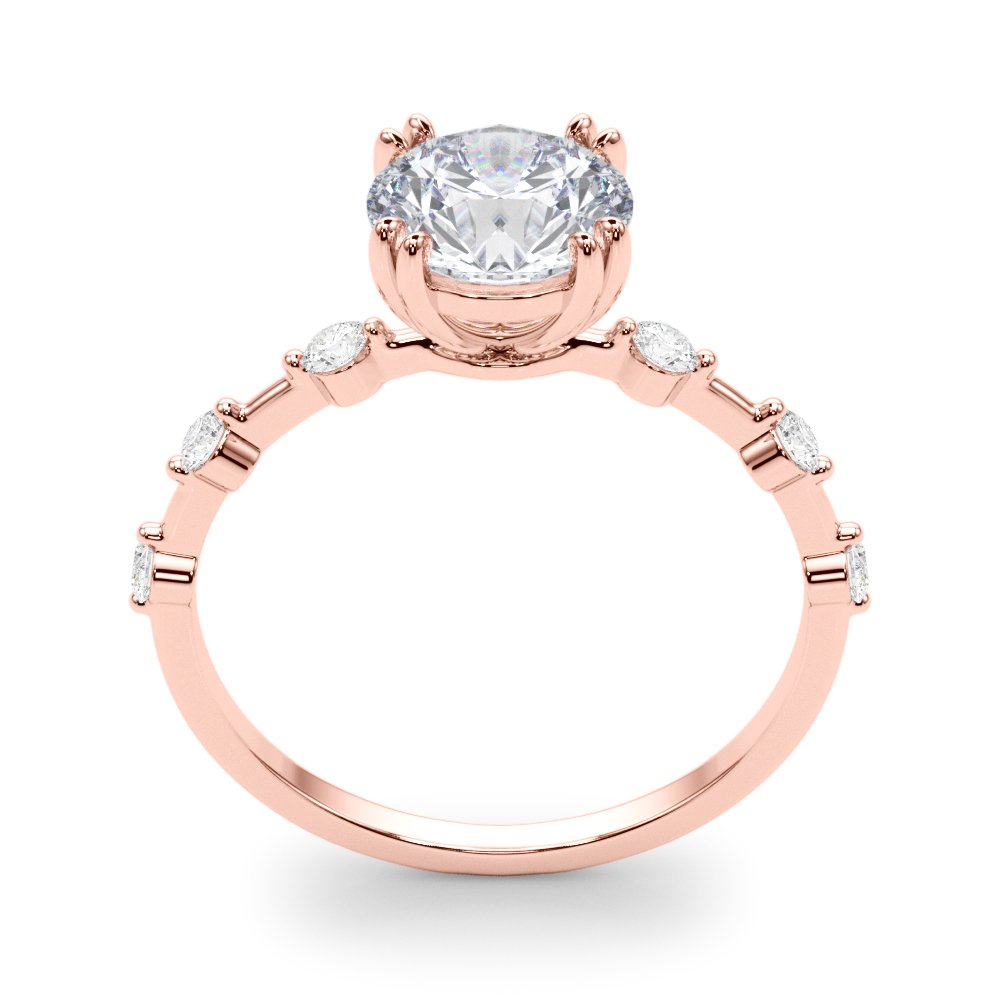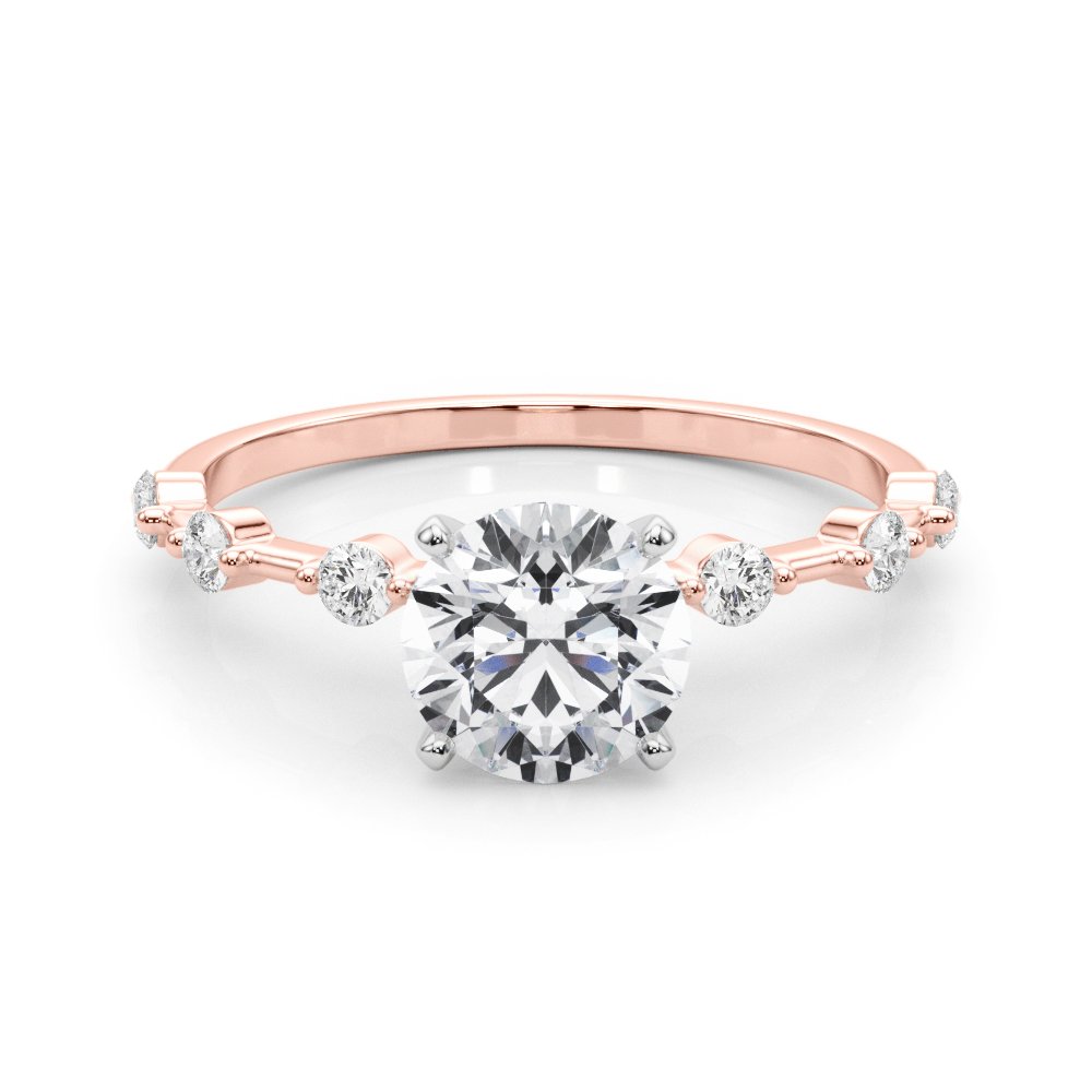 The Sofia Engagement Ring is a chic and modern design that pairs timeless elegance with contemporary detail. A brilliant round center diamond is secured in a classic four-prong setting, elevated to capture light from every angle. Along the band, bezel-inspired prongs hold a series of round accent diamonds in an open, airy arrangement that creates a delicate yet striking look. The alternating diamonds give the ring a rhythmic sparkle, while the slim, polished band keeps the focus on the artistry of the stones. Perfect for those who appreciate a fresh twist on tradition, the Sofia offers a refined balance of brilliance and sophistication.