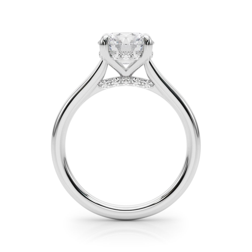 The Stella Diamond Engagement Ring features a four-prong setting with a hidden halo of pavé-set diamonds beneath the center stone. Designed to accommodate any shape and size, the elevated head allows for maximum light entry, enhancing brilliance. A curved pavé diamond bridge connects the shoulders beneath the setting, adding subtle sparkle and structural elegance. The band is sleek and rounded for a clean, balanced profile. Available in platinum, 18k yellow, white, or rose gold, the Stella offers a modern take on the classic solitaire with refined hidden detailing.