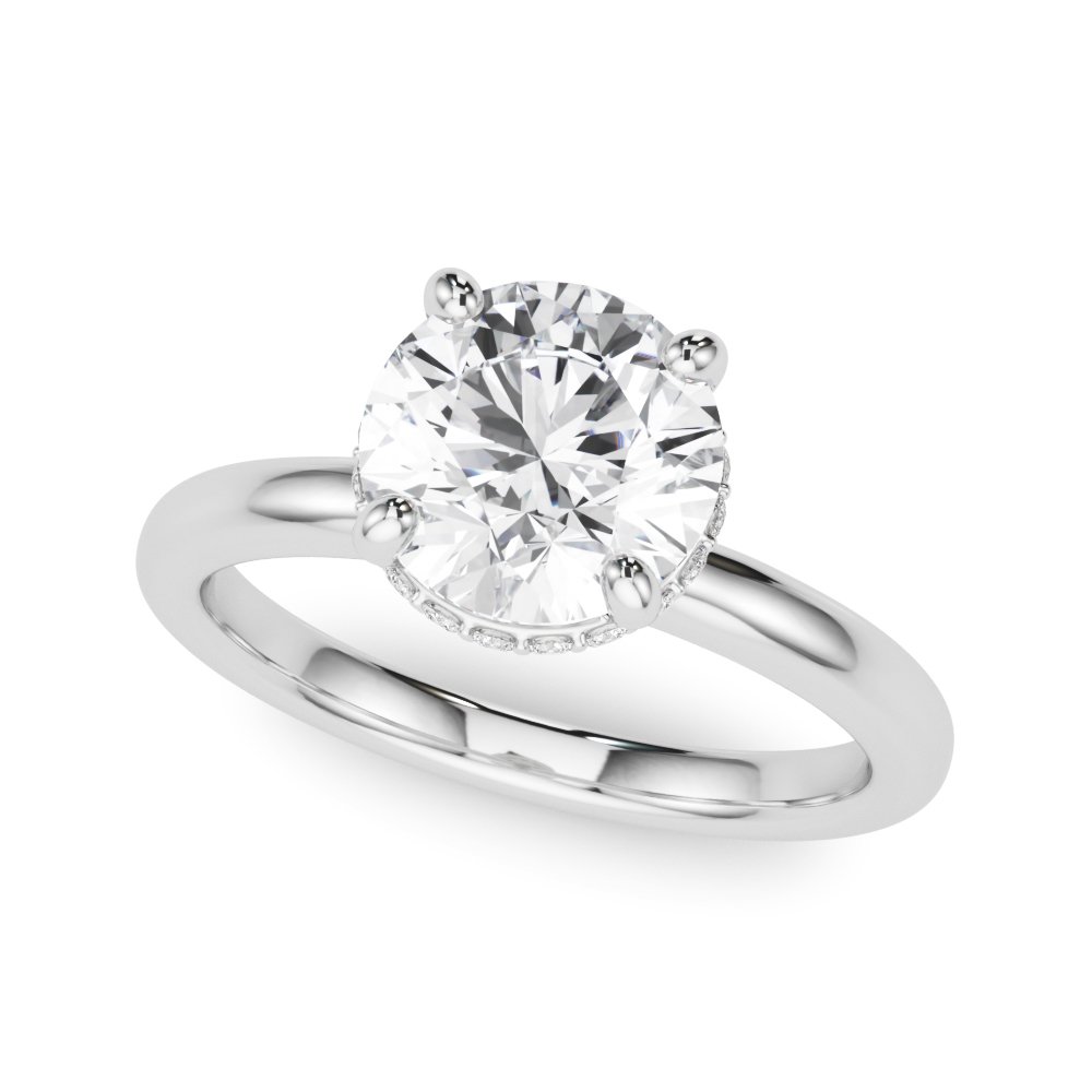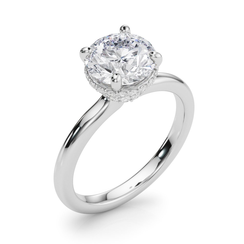 The Talia Diamond Engagement Ring features a polished, high-dome band with a clean, tapered silhouette. The center stone is secured in a four-prong setting, compatible with any diamond shape or size. The head is accented with two stacked pavé diamond halo's around the base and gallery, delivering 360° brilliance and enhanced visual structure. Designed for use with all metal types, including platinum, 18k and 14k gold (yellow, white, or rose), the setting offers a balanced elevation for light performance while maintaining compatibility with straight and contour wedding bands.