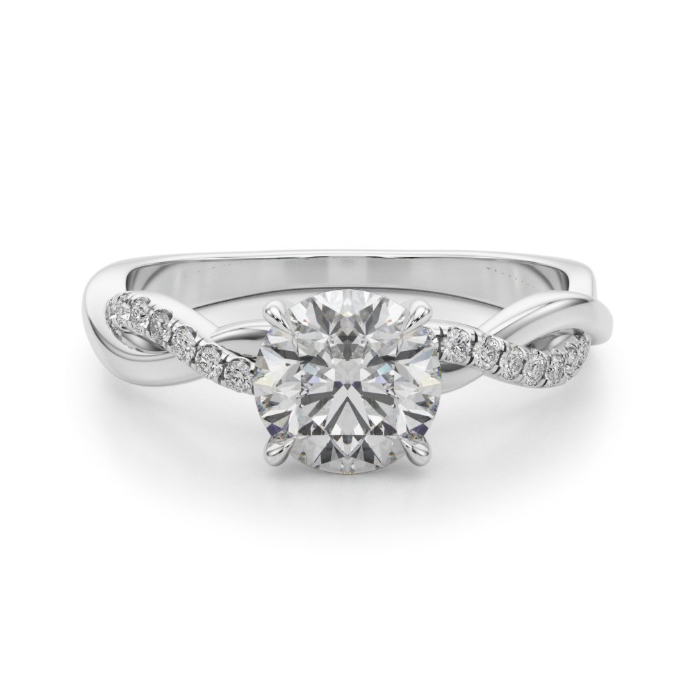 This elegant twisted shank diamond engagement ring features a round brilliant center stone secured in a classic four-prong setting. The shank is gracefully designed with an intertwining twist, where one strand is adorned with a series of meticulously set round pave diamonds for added sparkle and dimension. The band tapers slightly toward the center stone, enhancing its brilliance and prominence. Crafted in high-polish metal (available in platinum, white gold, yellow gold, or rose gold), the design offers a sophisticated balance of modern flair and timeless romance. Designed to accommodate a variety of center stone sizes and shapes.