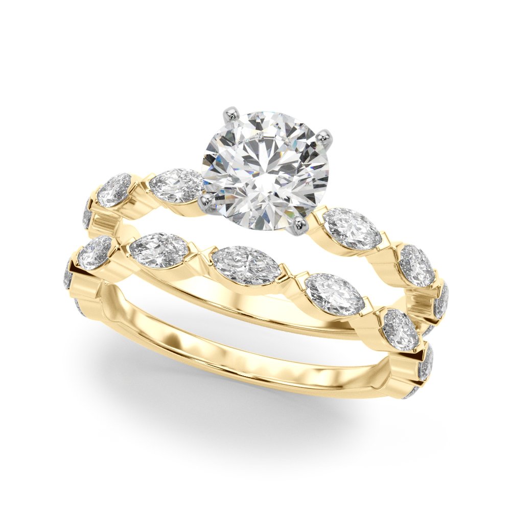 The Zella Diamond Engagement Ring features a round center diamond set on a band accented with alternating marquise and round bezel-set diamonds. The marquise stones are oriented horizontally along the band, creating a rhythmic pattern and enhancing the ring’s visual structure. The bezels add a clean, modern finish while securely framing each diamond. This design offers a refined, geometric look with a balance of brilliance and symmetry.