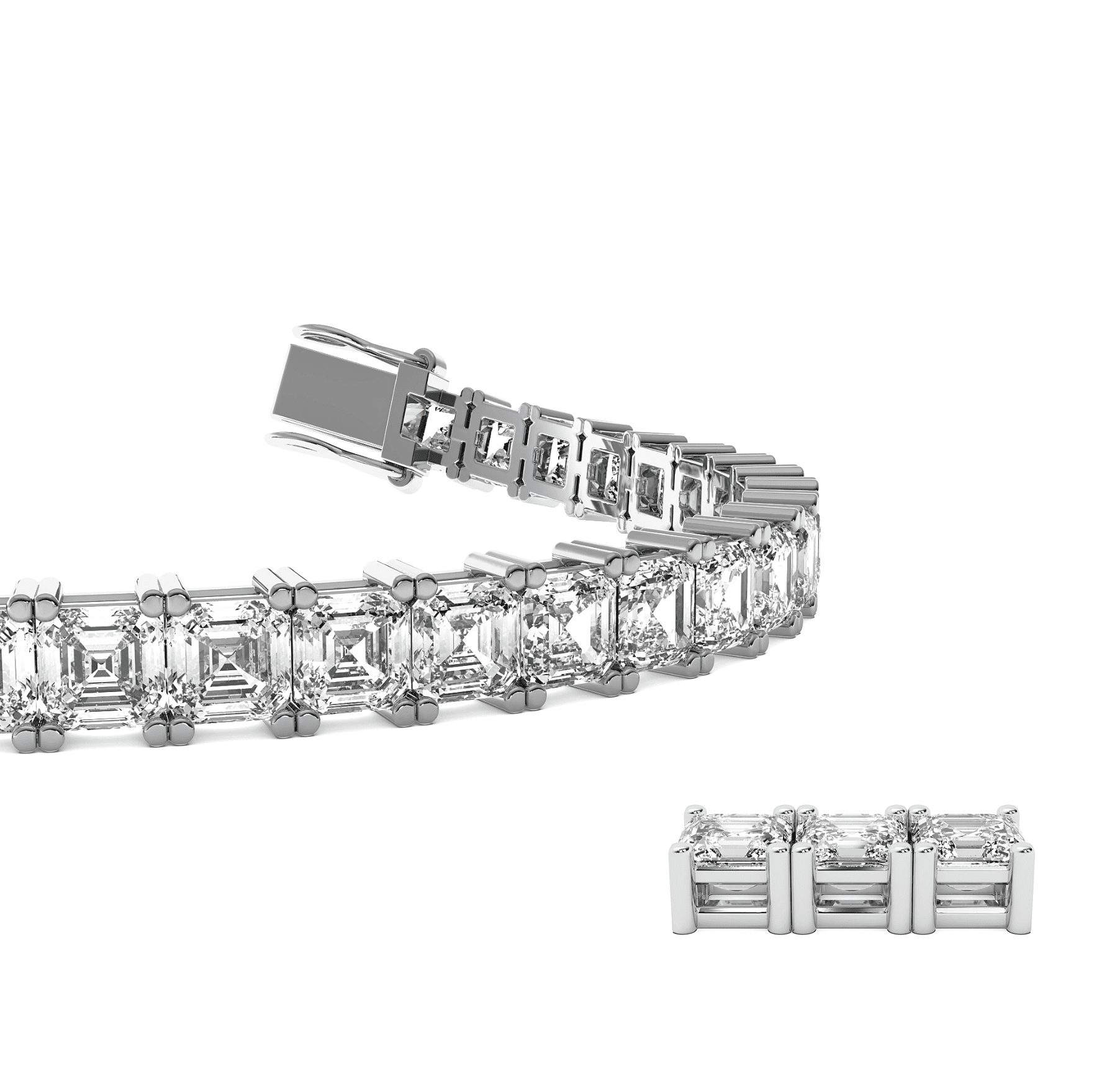 This bracelet features a continuous line of Asscher-cut diamonds, each precisely matched for size, color, and clarity. The step-cut facets of the Asscher diamonds create a refined hall-of-mirrors effect, offering a sophisticated alternative to traditional brilliant cuts. The diamonds are set in a secure four-prong or bezel-style setting, ensuring both durability and fluid movement along the wrist. Finished with a box clasp and safety latch for added security, this piece highlights timeless elegance with a geometric, modern edge.