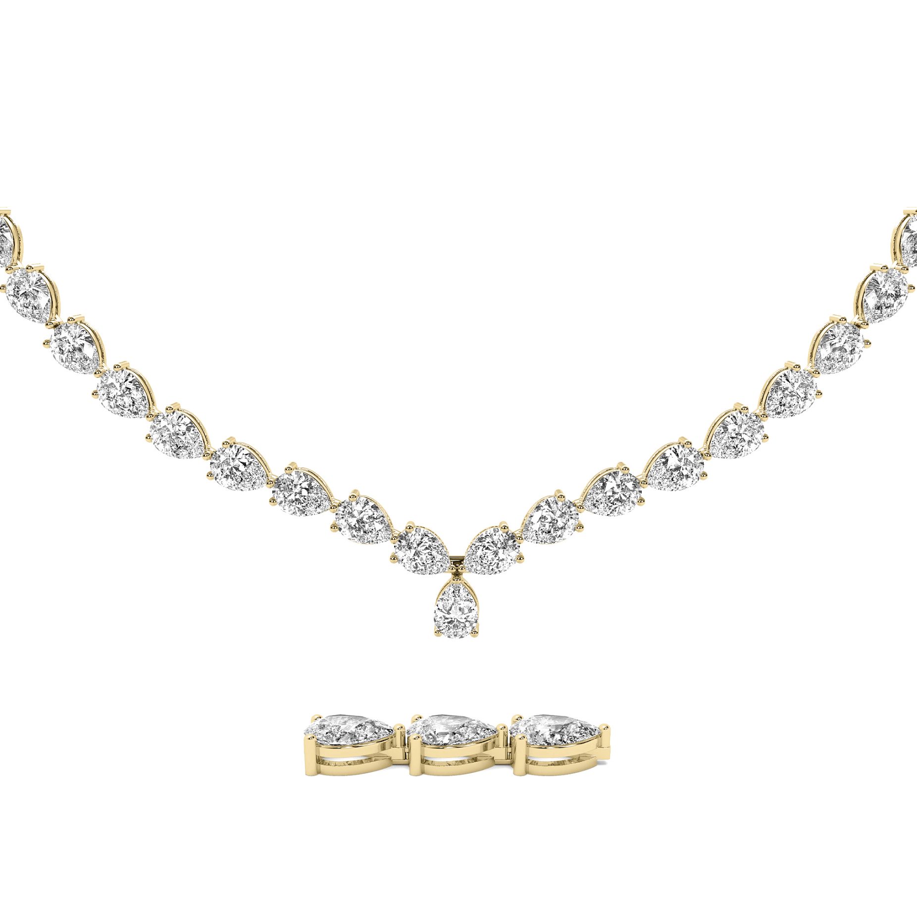 This 3-Prong Pear East to West necklace features a continuous line of meticulously matched Pear brilliant-cut diamonds, each secured in a timeless Three-prong setting that maximizes light exposure and enhances brilliance. Crafted in high-polish 14K or 18K gold or platinum, the Three-prong design offers both security and a refined, elegant profile. The diamonds are hand-selected for exceptional sparkle and uniformity, creating a seamless and radiant flow around the neckline. Ideal for both everyday luxury and formal occasions, this necklace is a sophisticated staple in any fine jewelry collection.