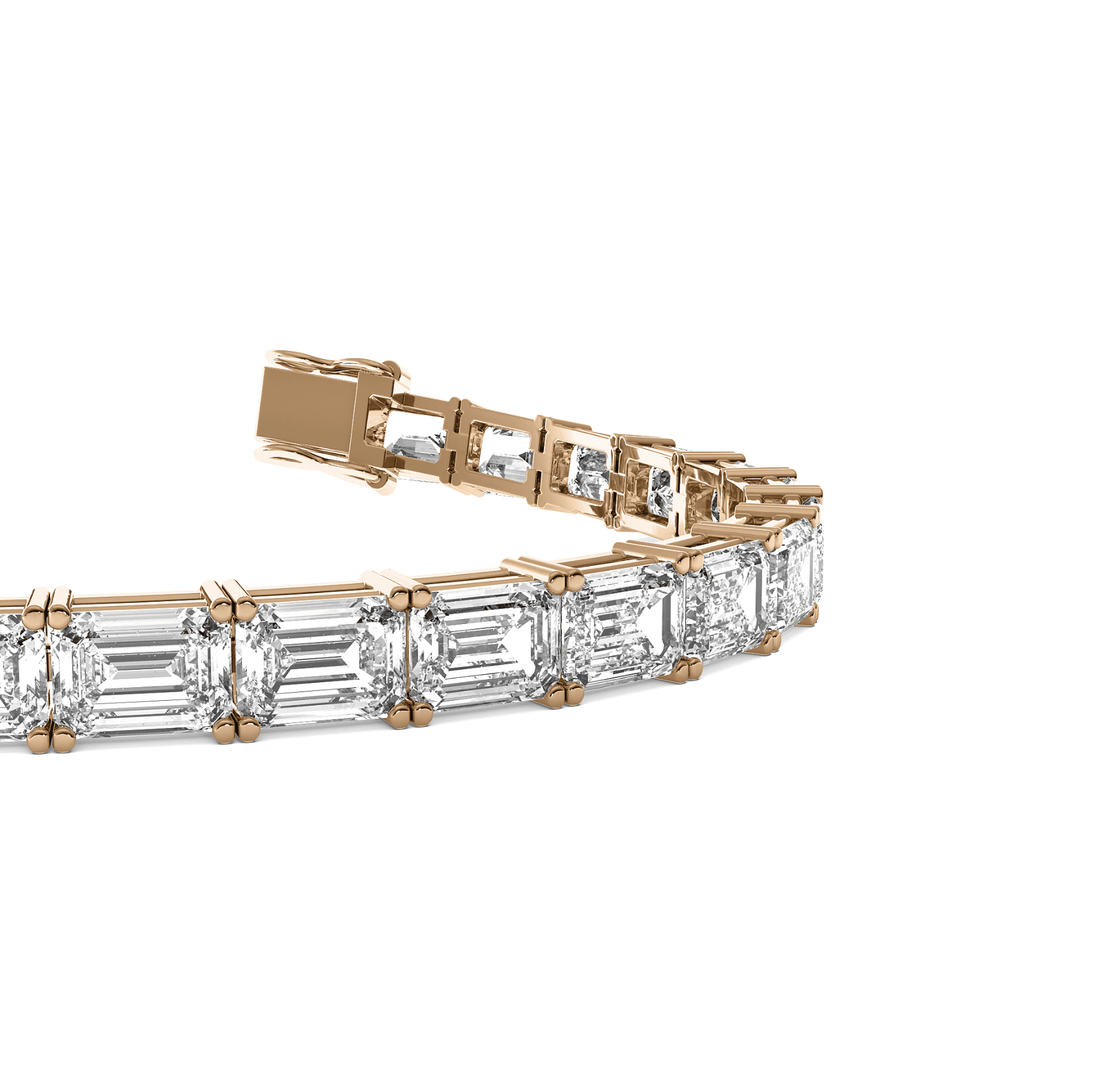 A timeless tennis bracelet featuring a continuous line of perfectly matched emerald-cut diamonds. Each stone is set east to west and secured in a refined setting, creating a sleek, uninterrupted design that emphasizes the clean geometry and elegant sparkle of the emerald cut. Finished with a secure clasp, this bracelet is a classic expression of sophistication and everyday luxury.