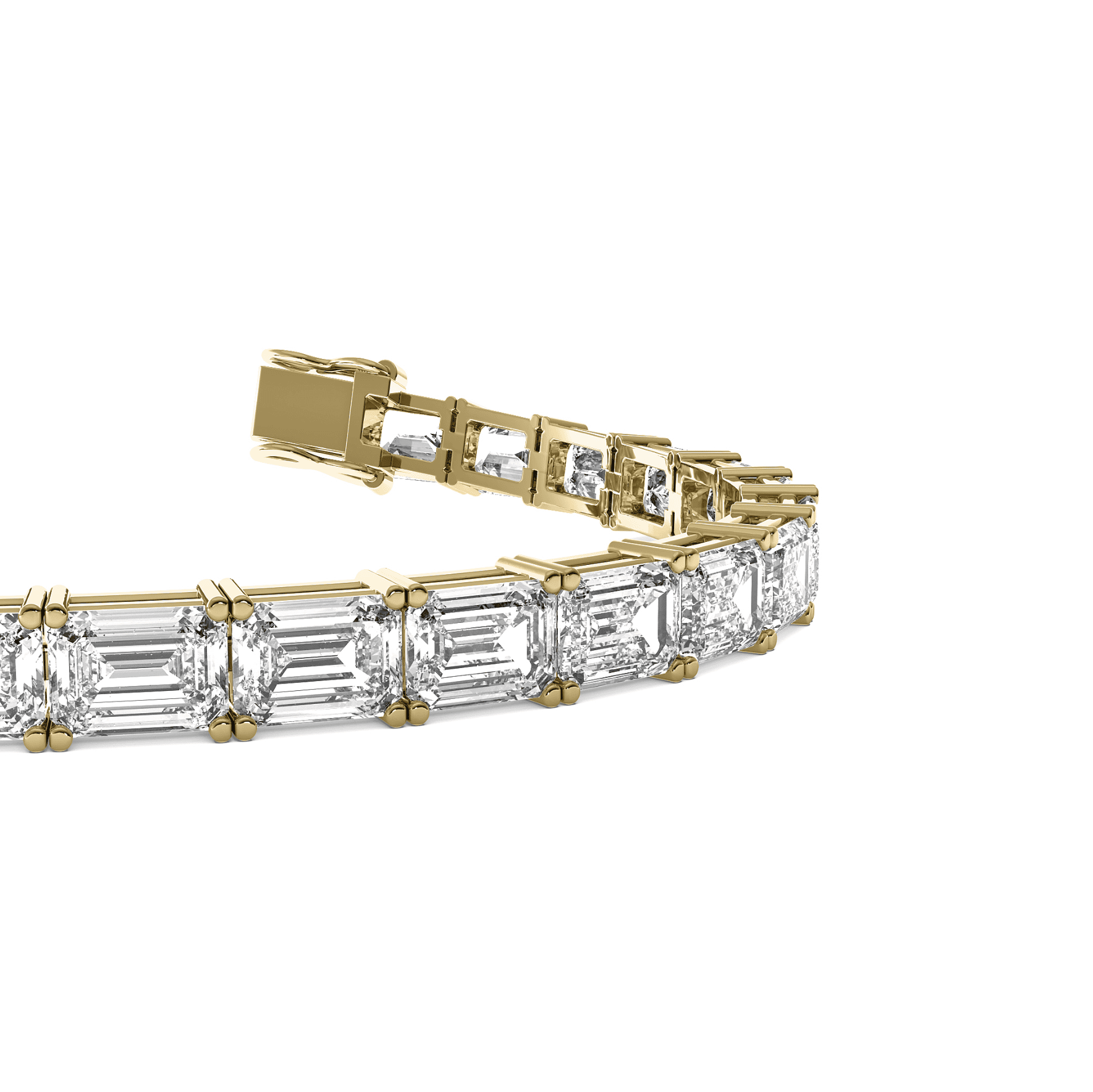 A timeless tennis bracelet featuring a continuous line of perfectly matched emerald-cut diamonds. Each stone is set east to west and secured in a refined setting, creating a sleek, uninterrupted design that emphasizes the clean geometry and elegant sparkle of the emerald cut. Finished with a secure clasp, this bracelet is a classic expression of sophistication and everyday luxury.