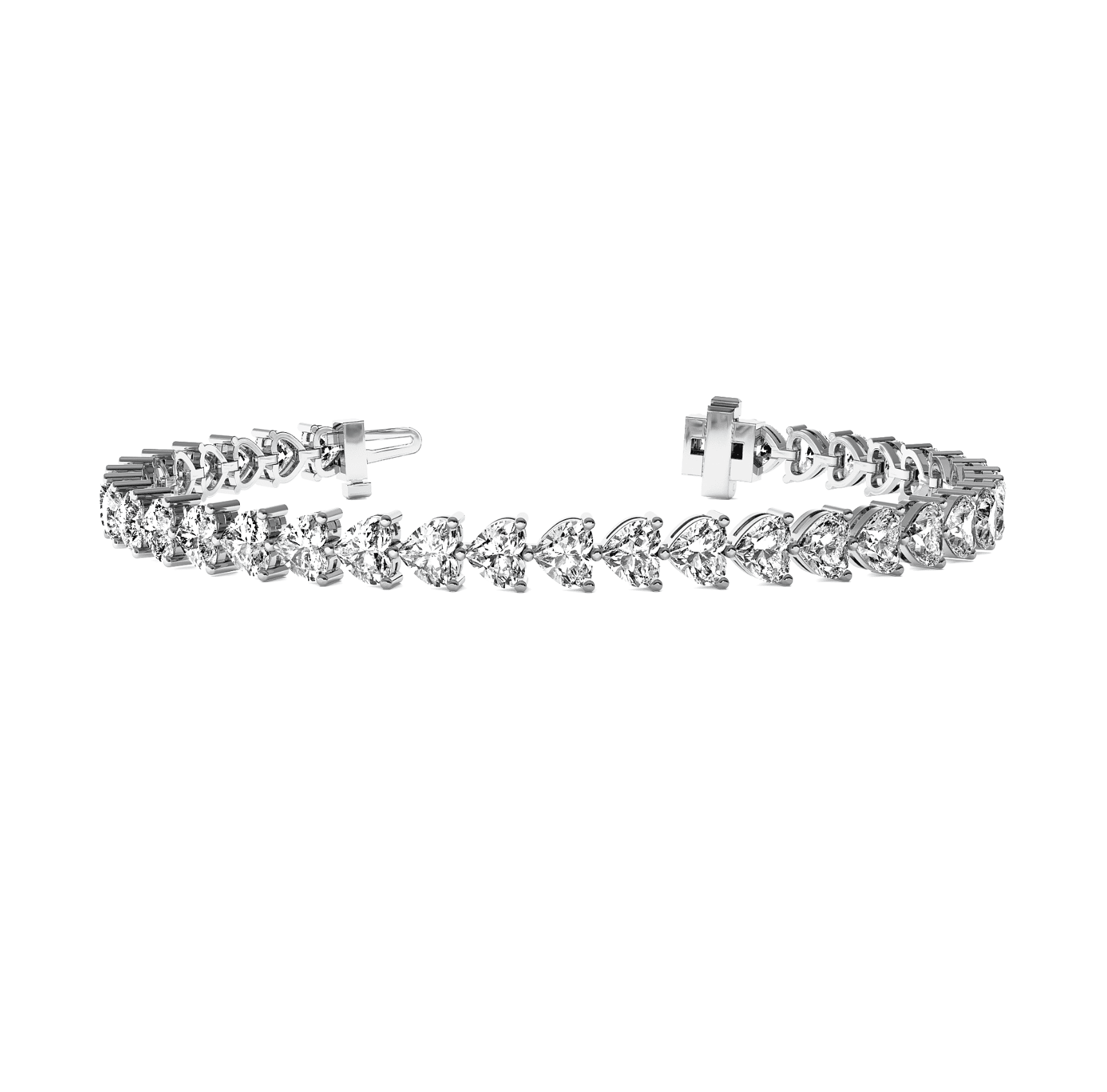 This bracelet features a continuous line of Heart-cut diamonds, each precisely matched for size, color, and clarity. The step-cut facets of the Heart diamonds create a refined hall-of-mirrors effect, offering a sophisticated alternative to traditional brilliant cuts. The diamonds are set in a secure four-prong or bezel-style setting, ensuring both durability and fluid movement along the wrist. Finished with a box clasp and safety latch for added security, this piece highlights timeless elegance with a geometric, modern edge.