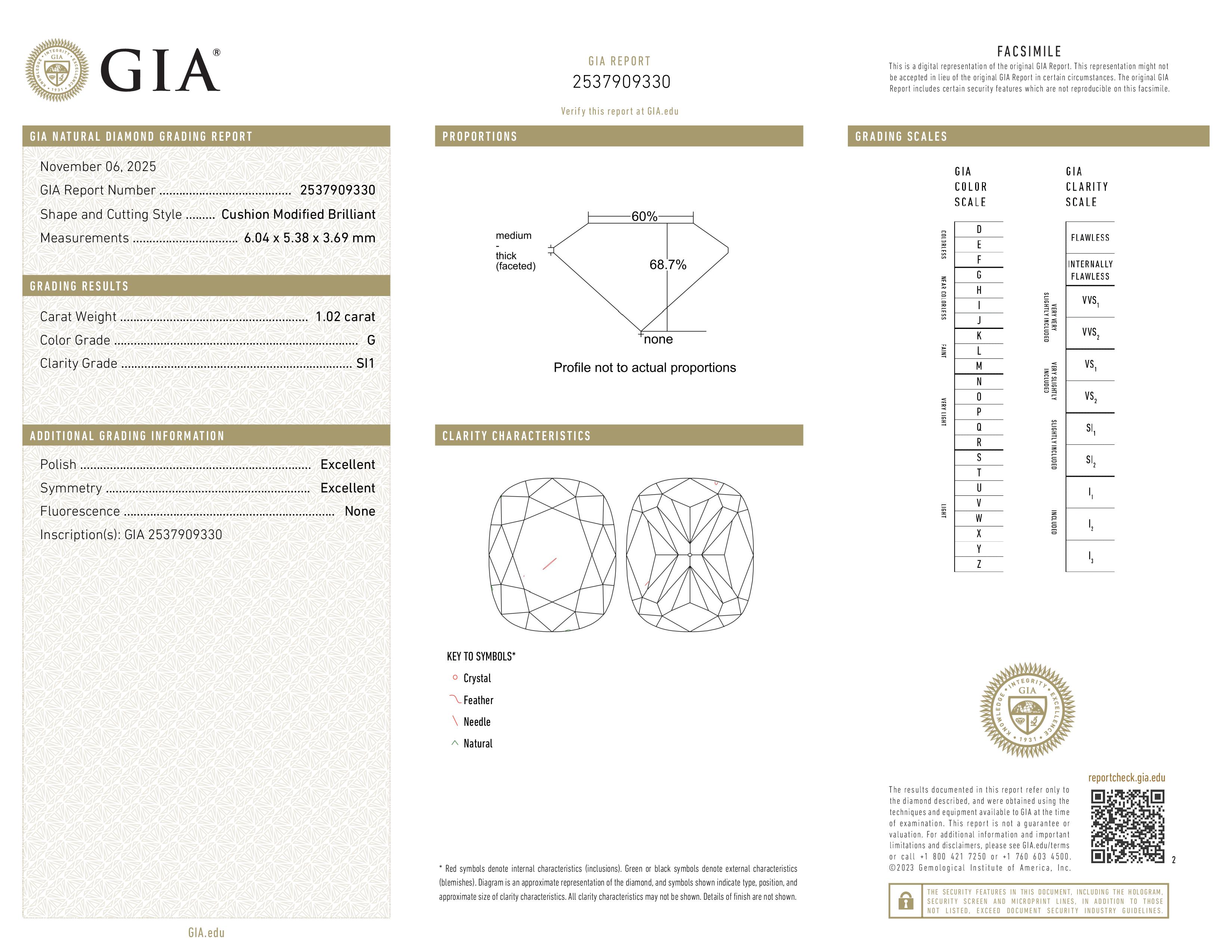 (SI1) This diamond contains few inclusions detectable using 10x magnification. However, when the diamond is set in jewelry, these inclusions are not usually visible to the naked eye. The SI1 graded diamonds are less expensive then higher clarity graded and therefore offer exceptional value for those that want to stay within budget and get a larger diamond. If you're unsure and want our opinion, just let us know and one of our gemologists will review it for you.