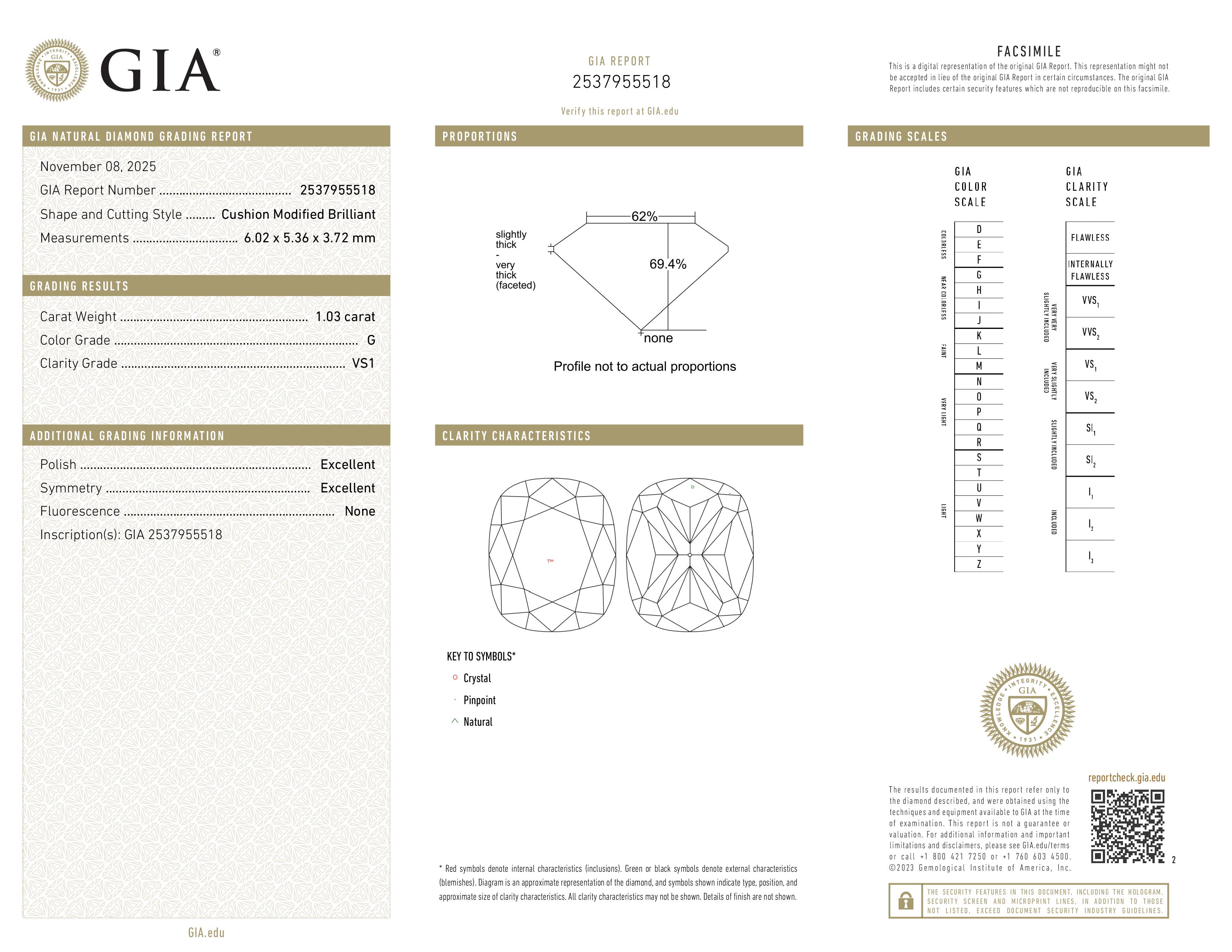 (VS1) This diamond contains very, few inclusions that are difficult for the untrained eye to see under 10x magnification. VS1 diamonds have no visible blemishes and are less expensive than higher clarity grades, therefore offering exceptional value while not compromising on quality.