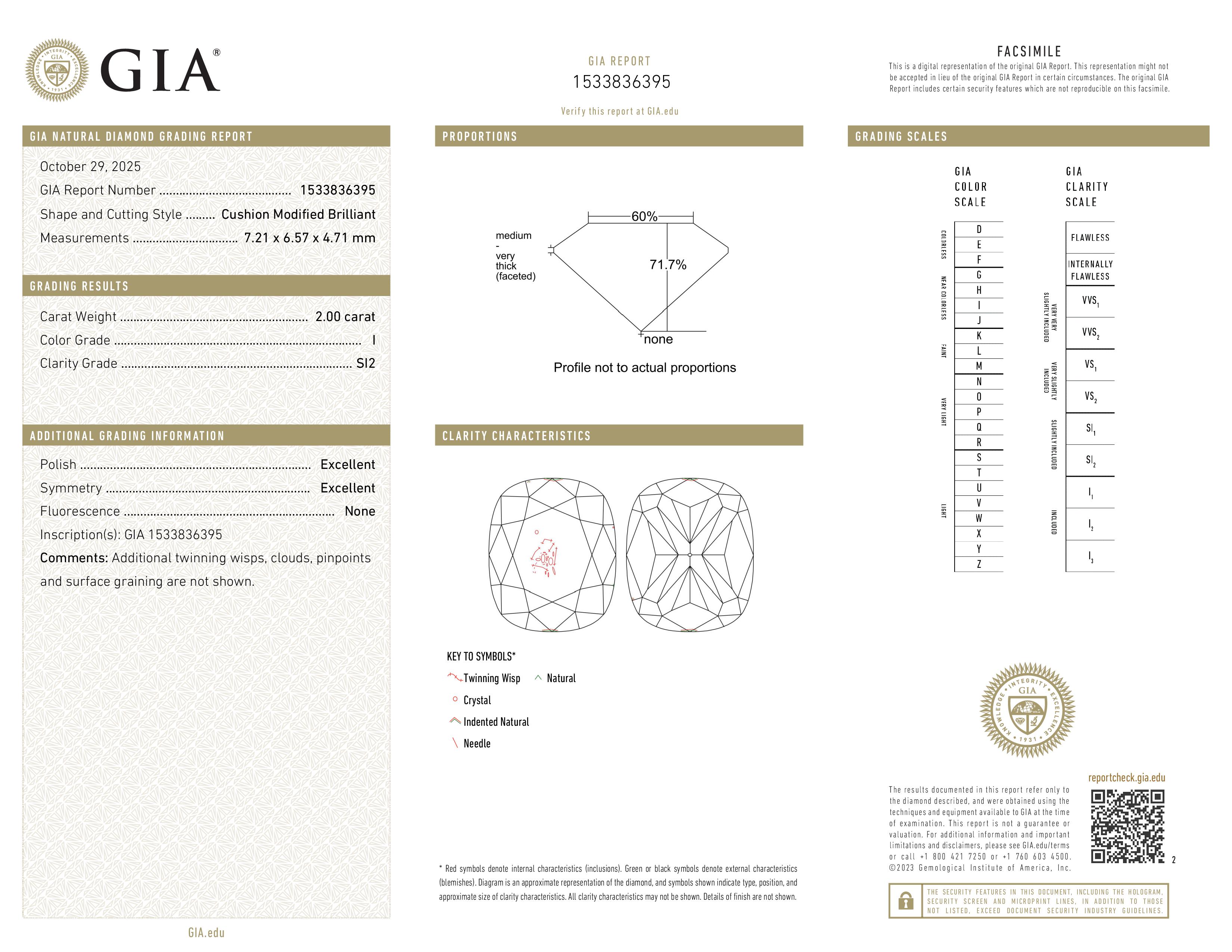 (SI2) Some inclusions are detectable under 10x magnification, even to the untrained eye. However, when the diamond is set in jewelry, these inclusions are not usually visible to the naked eye. The SI2 graded diamonds are less expensive then higher clarity graded and therefore offer exceptional value for those that want to stay within budget and get a larger diamond. If you're unsure and want our opinion, just let us know and one of our gemologists will review it for you.