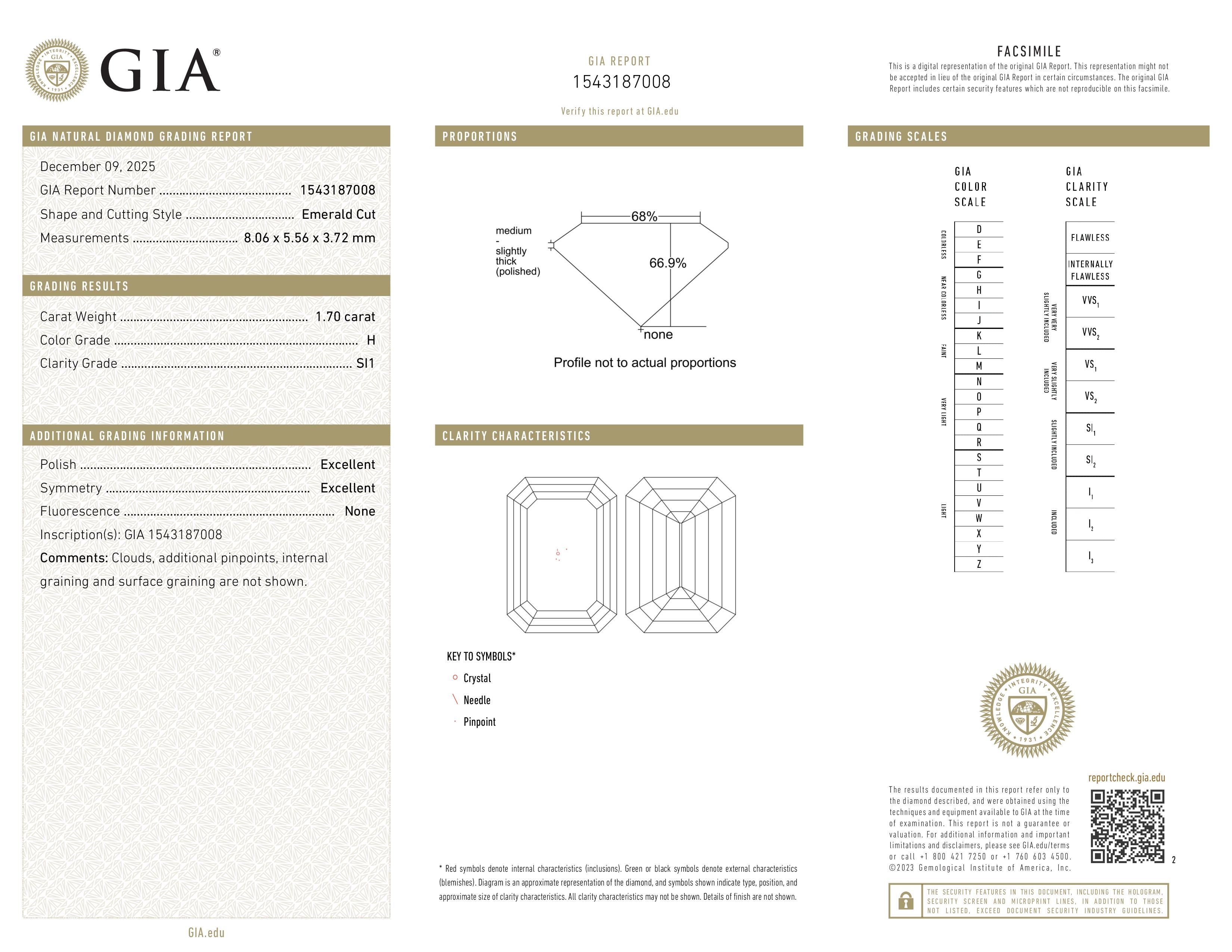 (SI1) This diamond contains few inclusions detectable using 10x magnification. However, when the diamond is set in jewelry, these inclusions are not usually visible to the naked eye. The SI1 graded diamonds are less expensive then higher clarity graded and therefore offer exceptional value for those that want to stay within budget and get a larger diamond. If you're unsure and want our opinion, just let us know and one of our gemologists will review it for you.