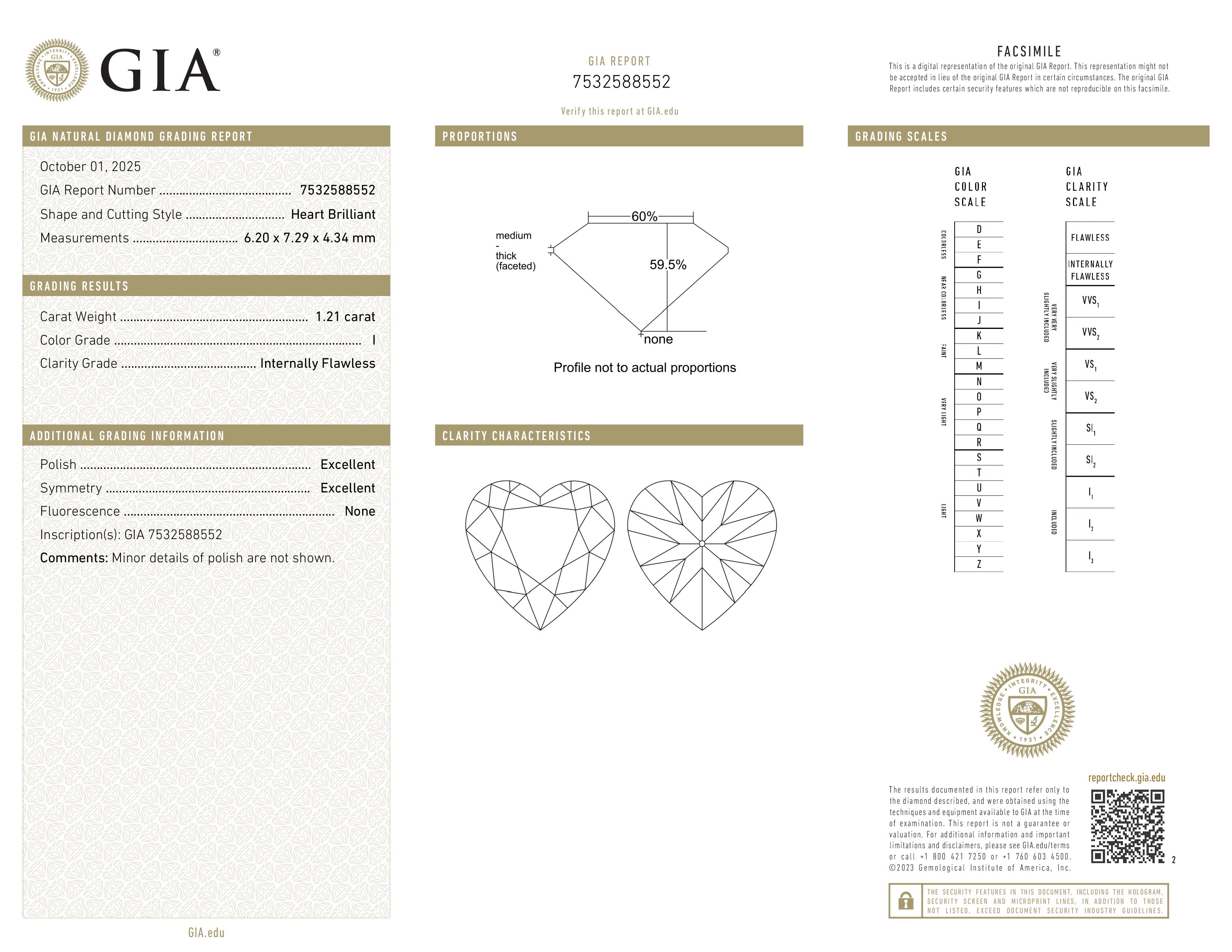 (IF) This diamond contains no internal inclusions when examined by a skilled grader even under high microscopic magnification. The only difference between this diamond and a flawless diamond are extremely minor markings or blemishes on the surface when viewed under 30X magnification. IF is considered top-quality and extremely rare.