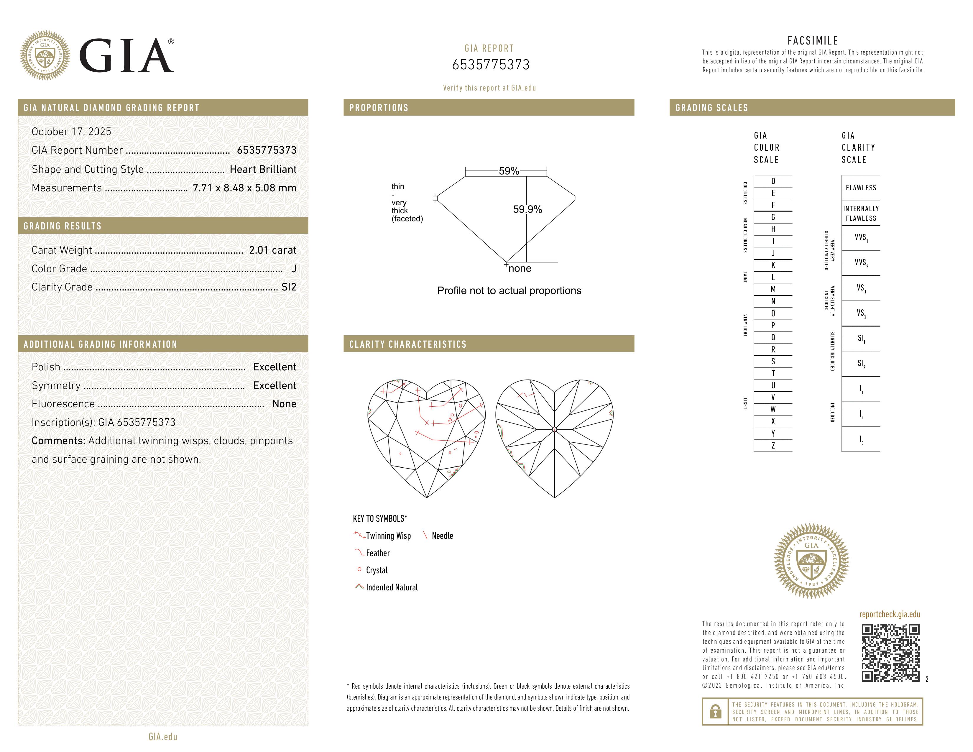 (SI2) Some inclusions are detectable under 10x magnification, even to the untrained eye. However, when the diamond is set in jewelry, these inclusions are not usually visible to the naked eye. The SI2 graded diamonds are less expensive then higher clarity graded and therefore offer exceptional value for those that want to stay within budget and get a larger diamond. If you're unsure and want our opinion, just let us know and one of our gemologists will review it for you.