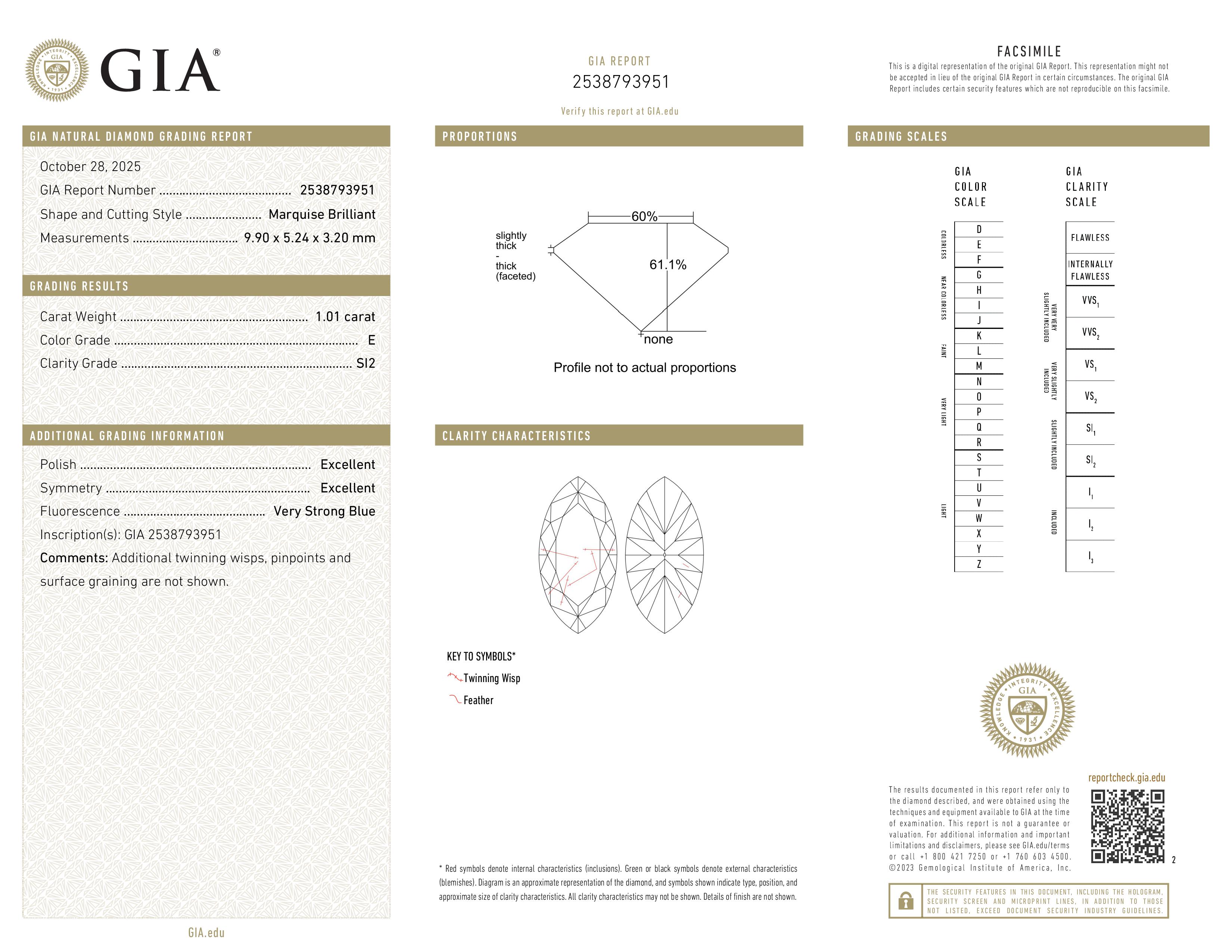 (SI2) Some inclusions are detectable under 10x magnification, even to the untrained eye. However, when the diamond is set in jewelry, these inclusions are not usually visible to the naked eye. The SI2 graded diamonds are less expensive then higher clarity graded and therefore offer exceptional value for those that want to stay within budget and get a larger diamond. If you're unsure and want our opinion, just let us know and one of our gemologists will review it for you.