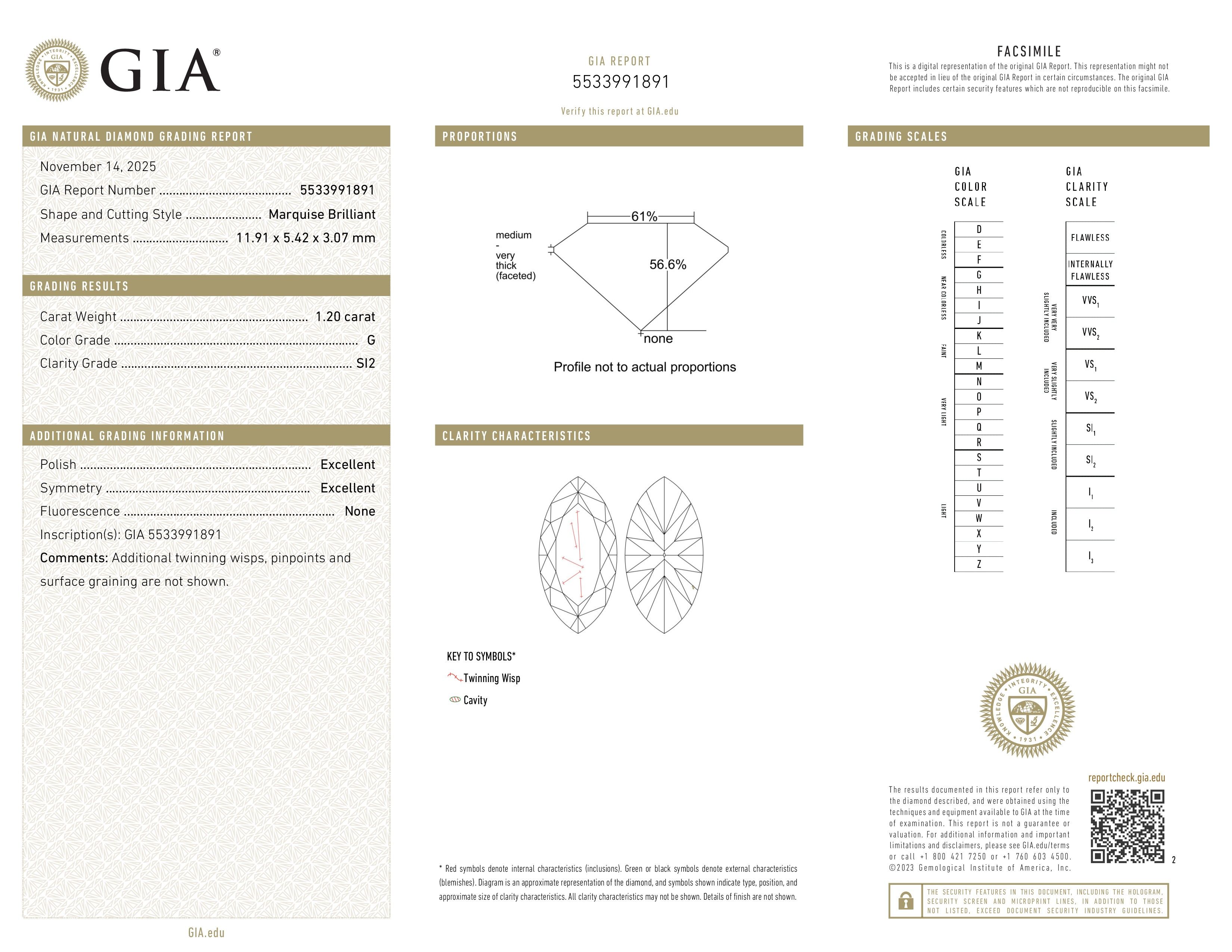 (SI2) Some inclusions are detectable under 10x magnification, even to the untrained eye. However, when the diamond is set in jewelry, these inclusions are not usually visible to the naked eye. The SI2 graded diamonds are less expensive then higher clarity graded and therefore offer exceptional value for those that want to stay within budget and get a larger diamond. If you're unsure and want our opinion, just let us know and one of our gemologists will review it for you.