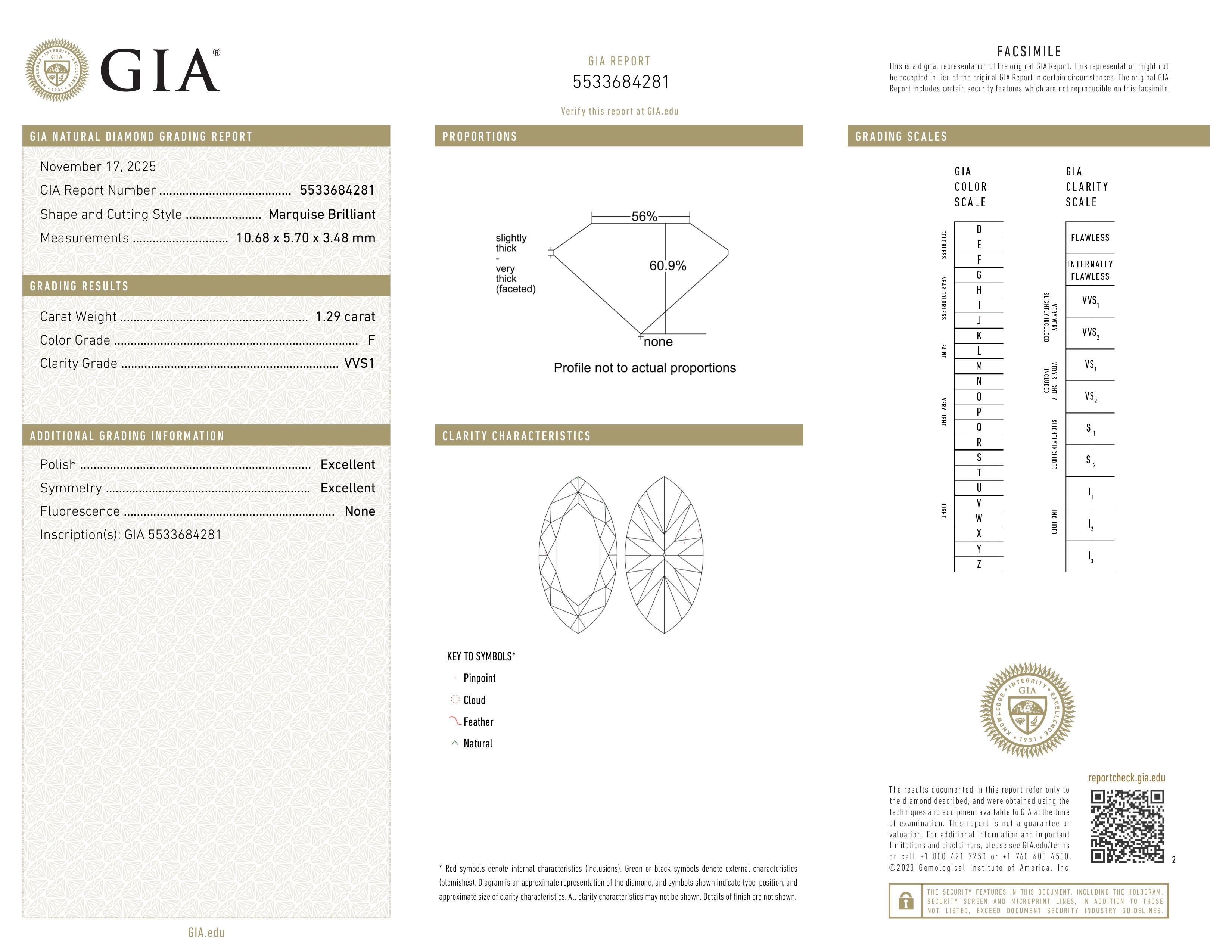 (VVS1) This diamond has very, very small inclusions. The minute inclusions are difficult for even a trained grader to see under 30x magnification. VVS1 graded diamonds are very rare.