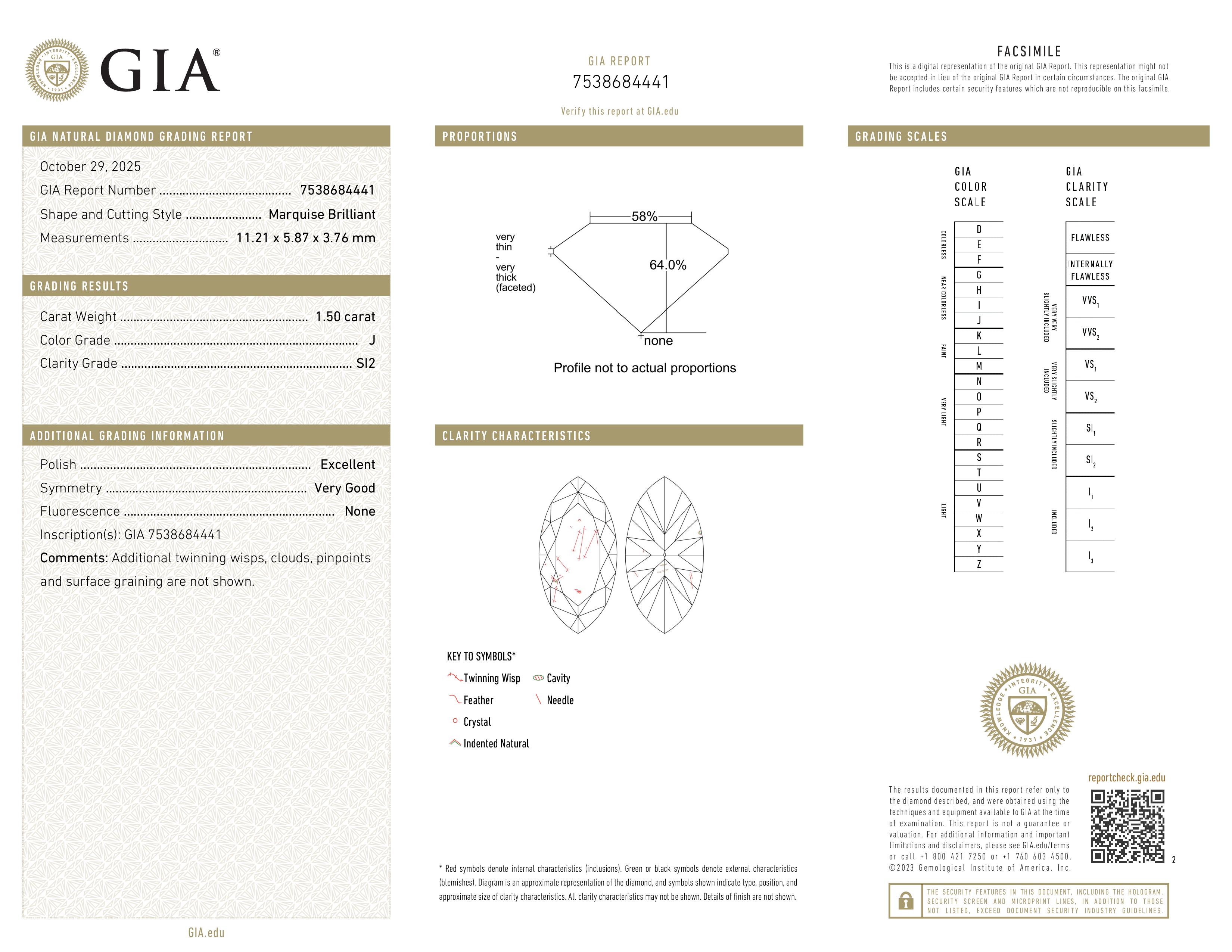 (SI2) Some inclusions are detectable under 10x magnification, even to the untrained eye. However, when the diamond is set in jewelry, these inclusions are not usually visible to the naked eye. The SI2 graded diamonds are less expensive then higher clarity graded and therefore offer exceptional value for those that want to stay within budget and get a larger diamond. If you're unsure and want our opinion, just let us know and one of our gemologists will review it for you.